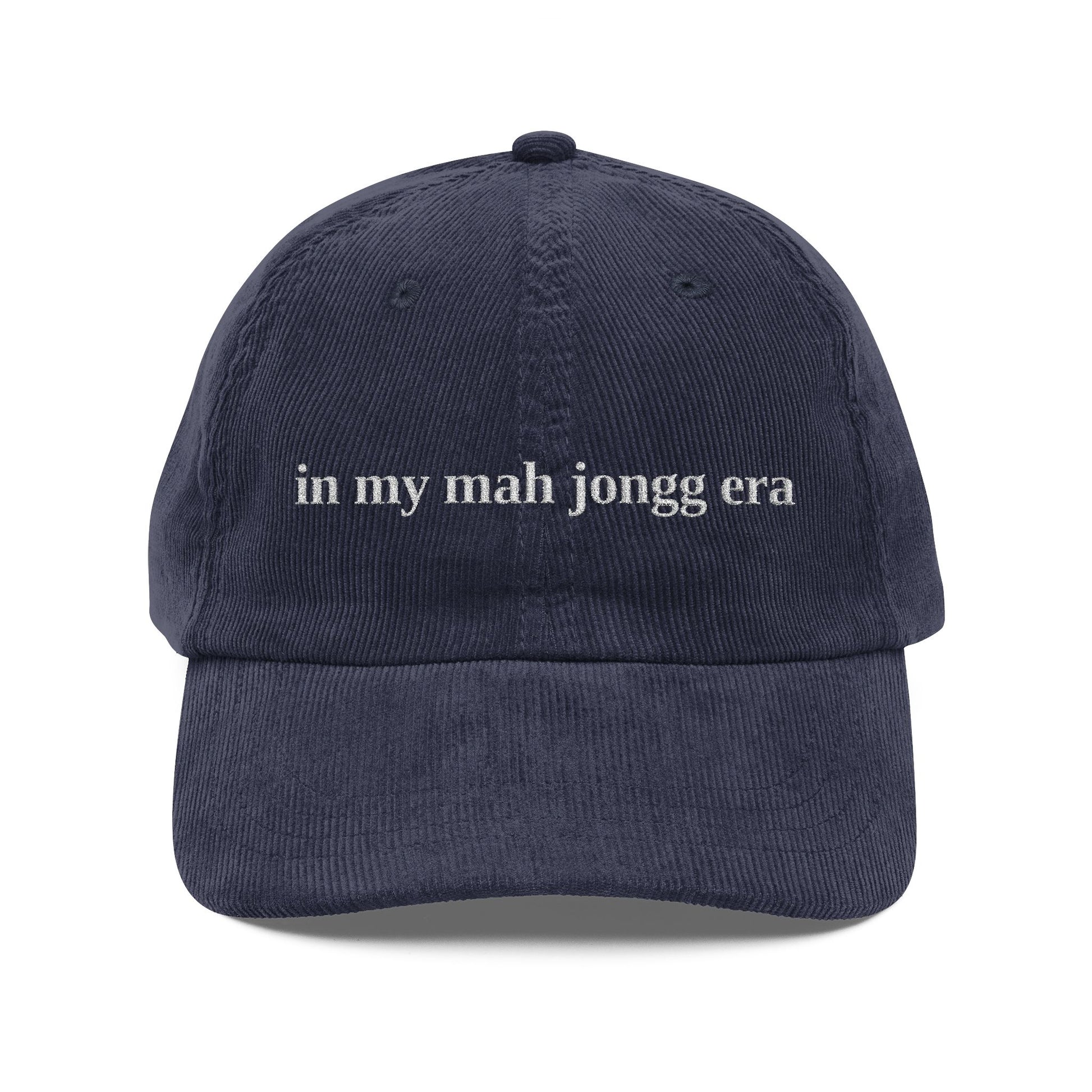 A vintage corduroy cap embroidered with "in my mah jongg era" in a simple but bold font, perfect for adding a touch of retro style to your outfits. This cap exudes a nostalgic vibe and is a great accessory for lovers of vintage fashion. Ideal for those who enjoy playing Mah Jongg, this cap is a fun and unique piece to wear during game nights, gatherings with friends and family, or on casual days about the town.
