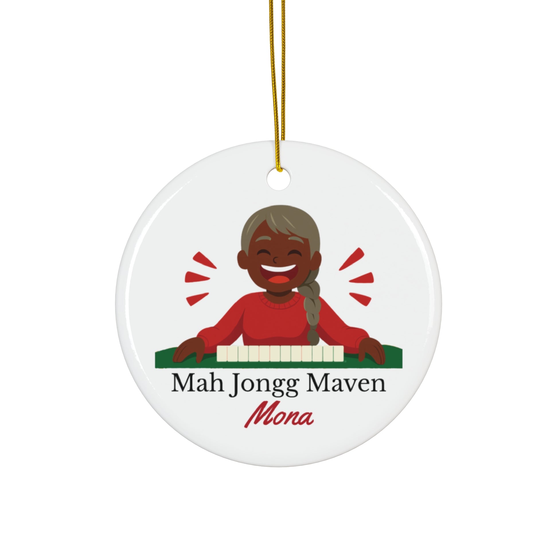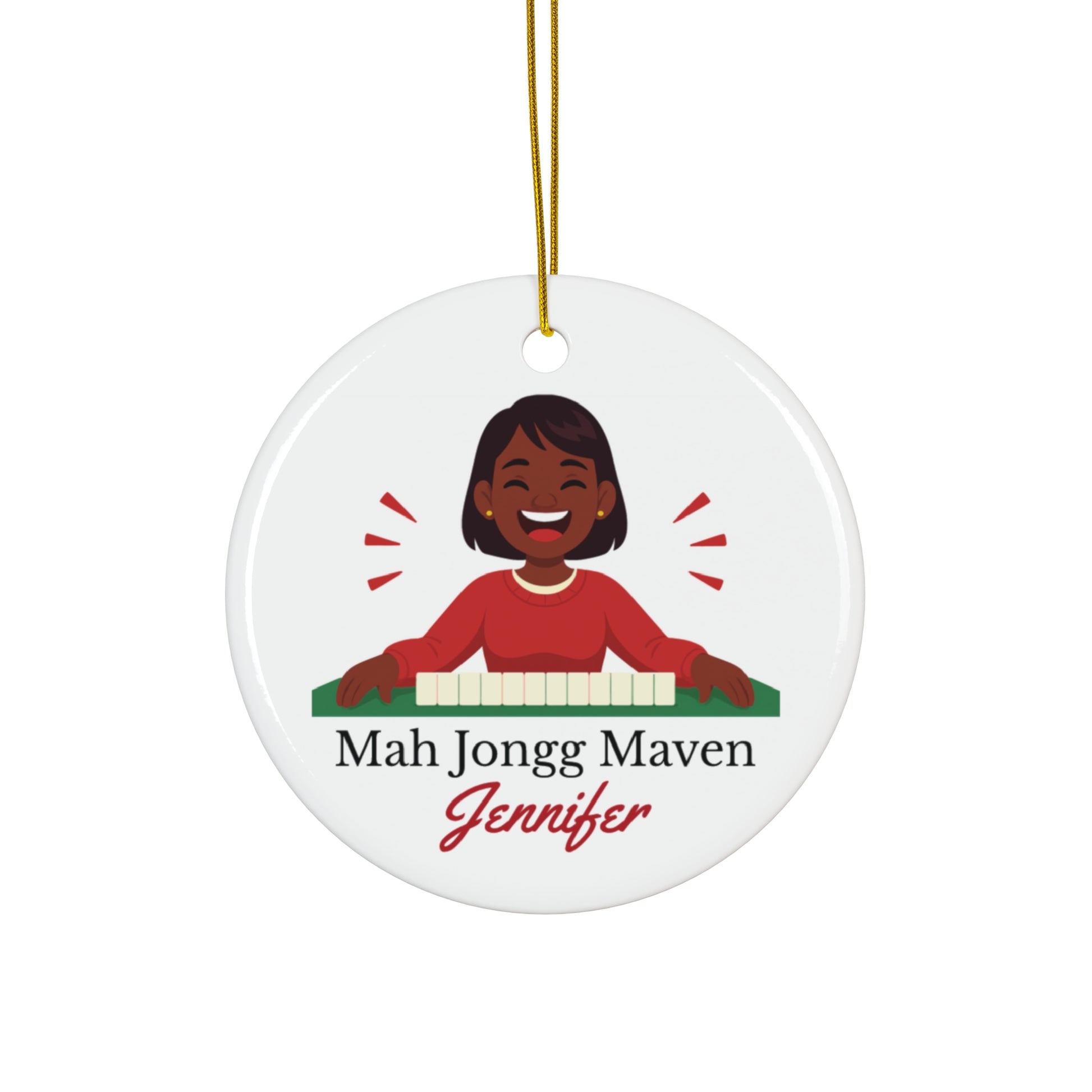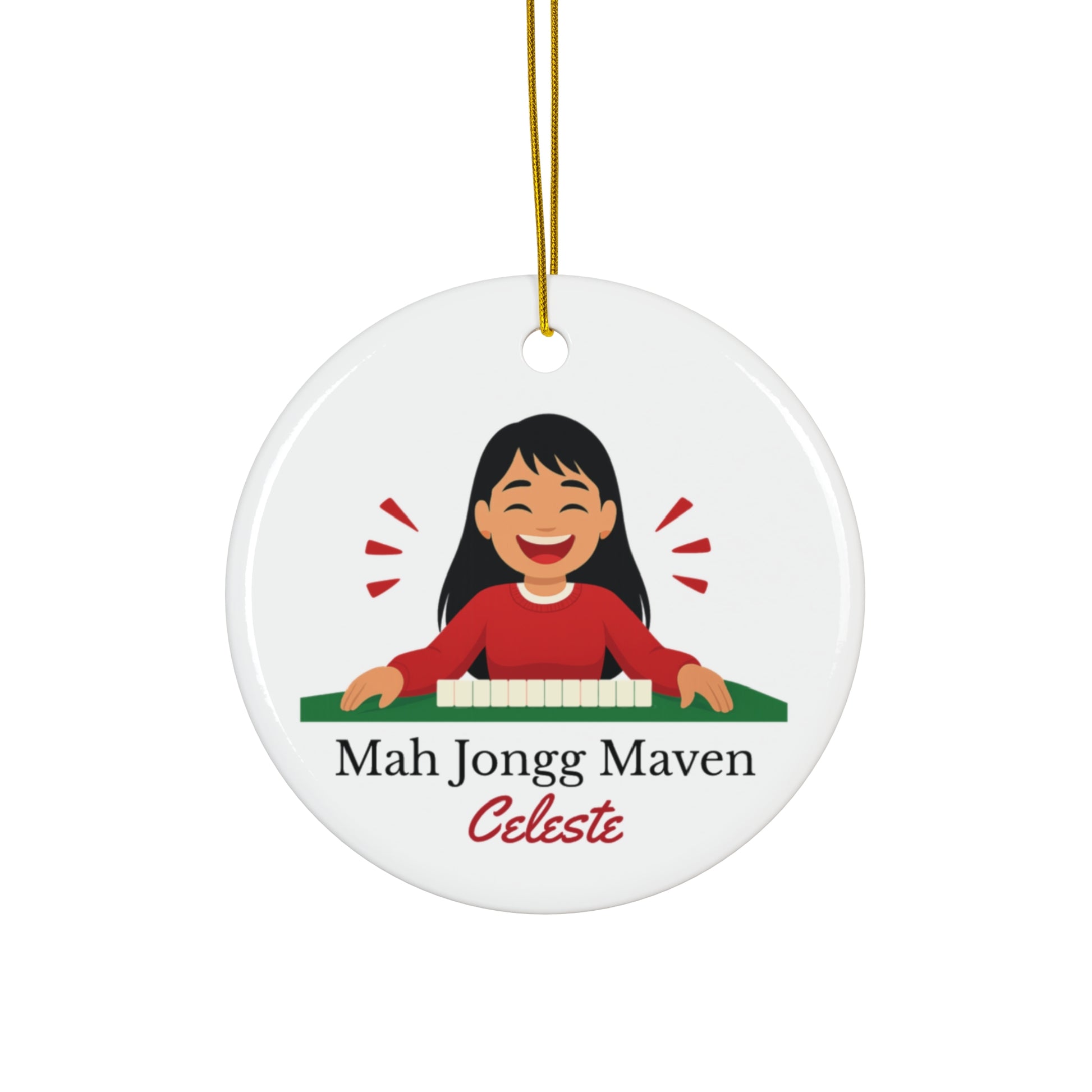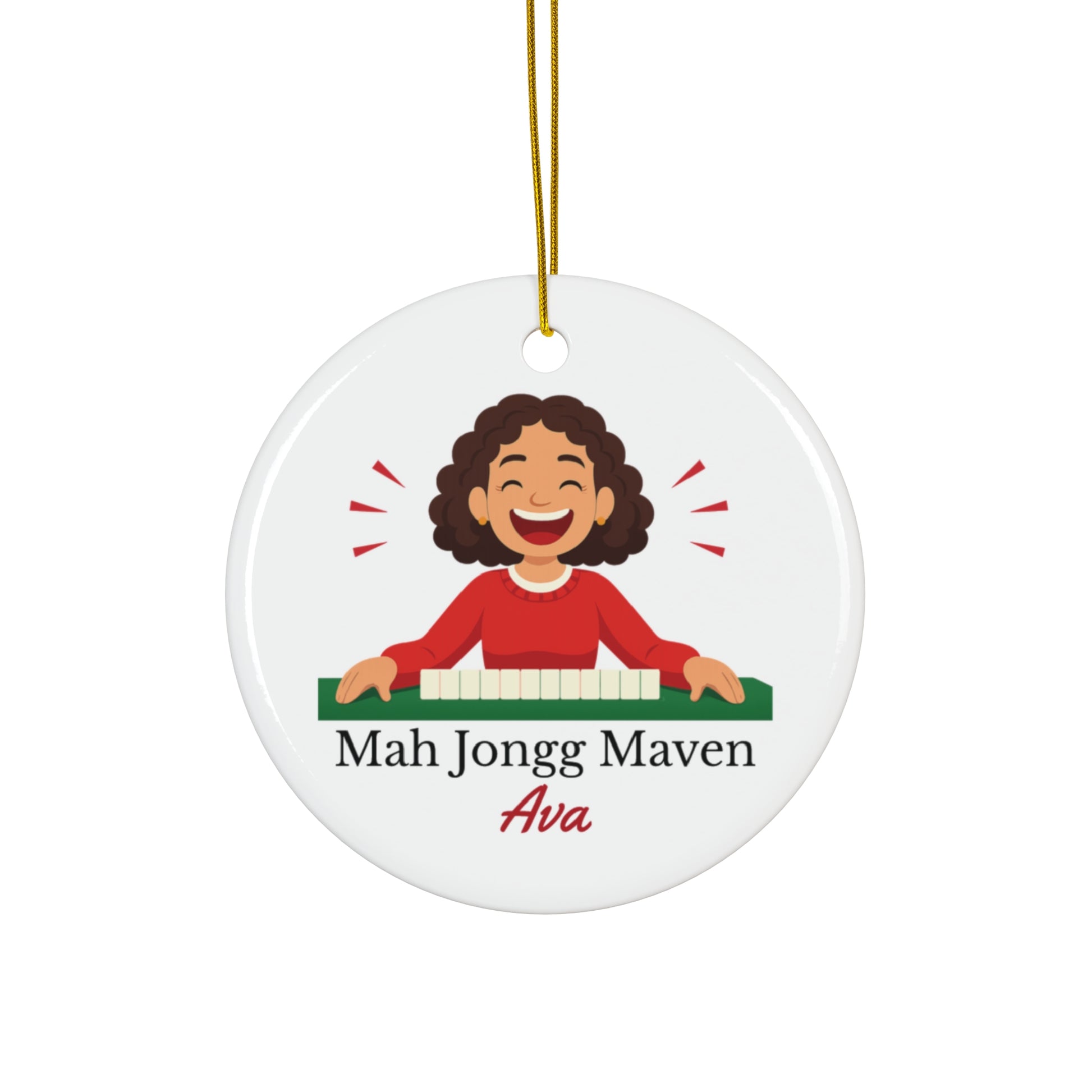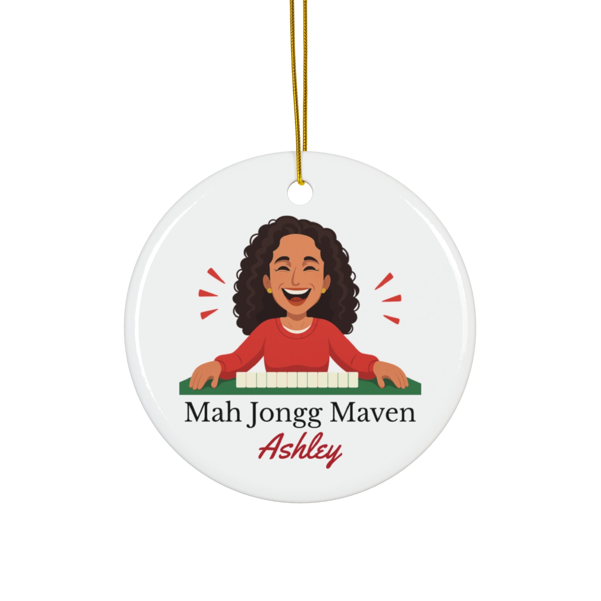 Add a touch of personalized fun to your holiday decor with this ceramic ornament featuring a cartoon avatar playing Mah Jongg and the phrase 'Mah Jongg Maven'. Perfect for Mah Jongg enthusiasts and those who love unique ornaments to hang on their Christmas tree or around the house during the holiday season. Don't see an avatar with the look you want? Contact us (merch@myjongg.net) and let's chat!