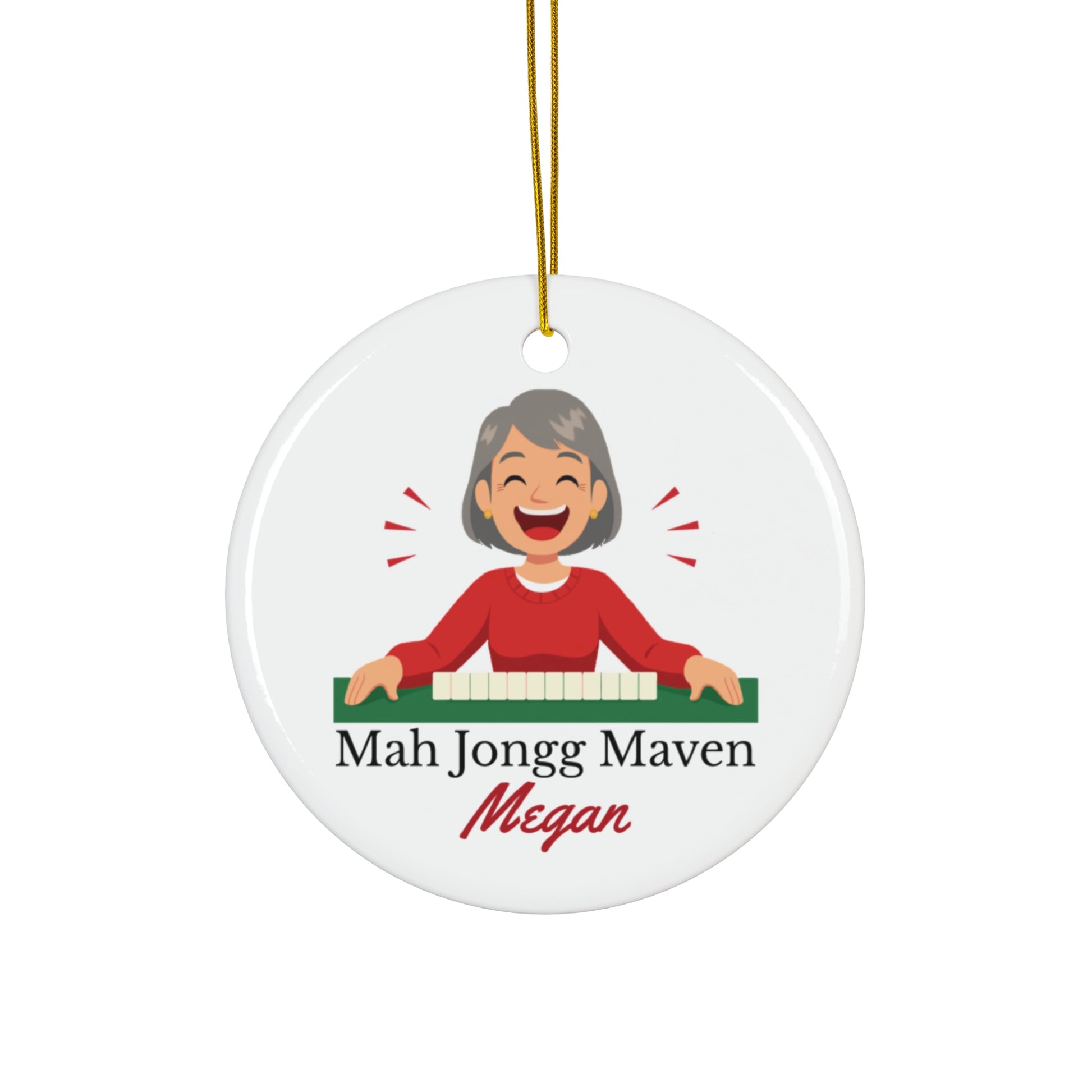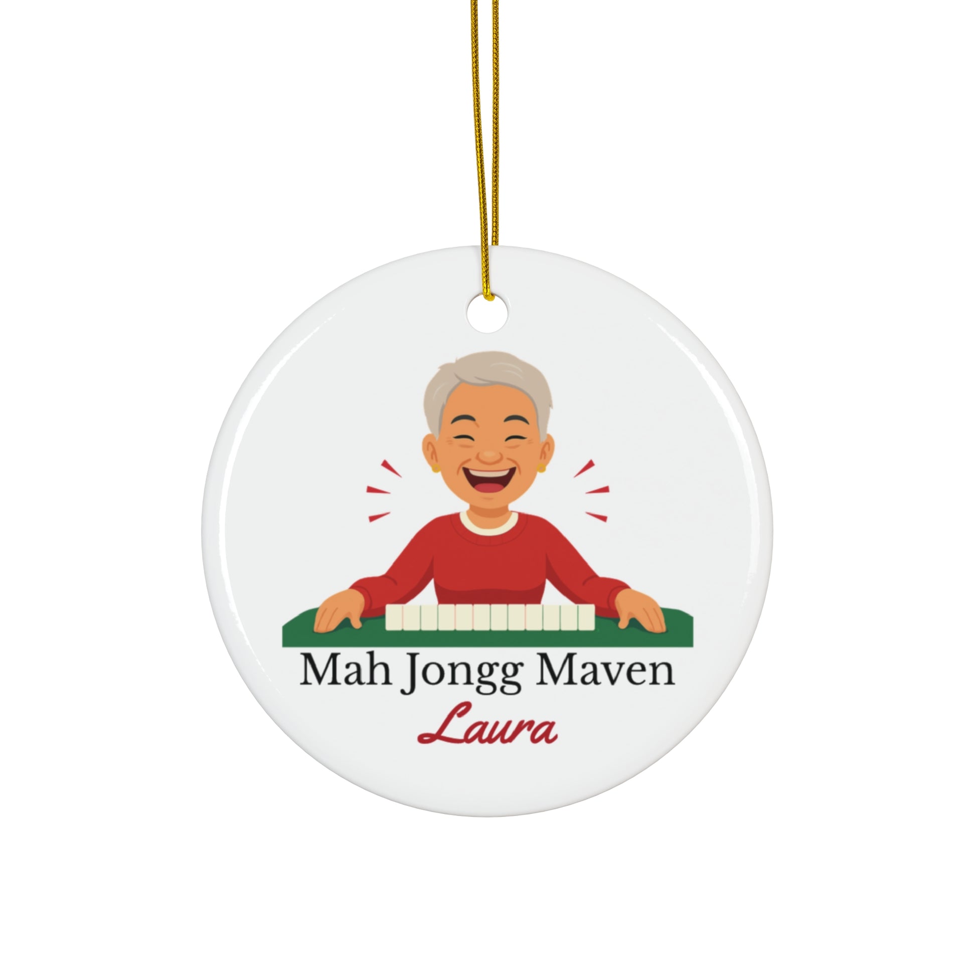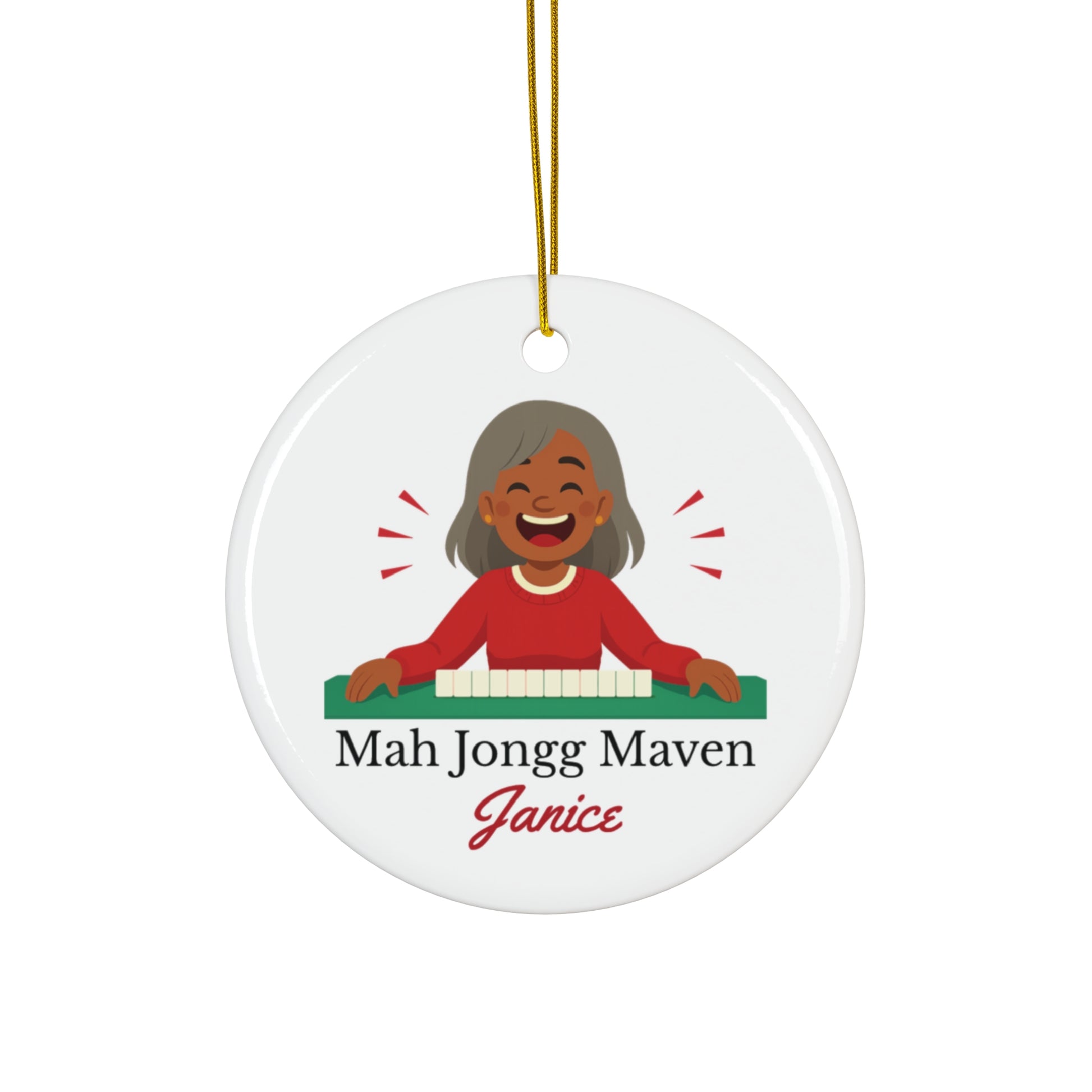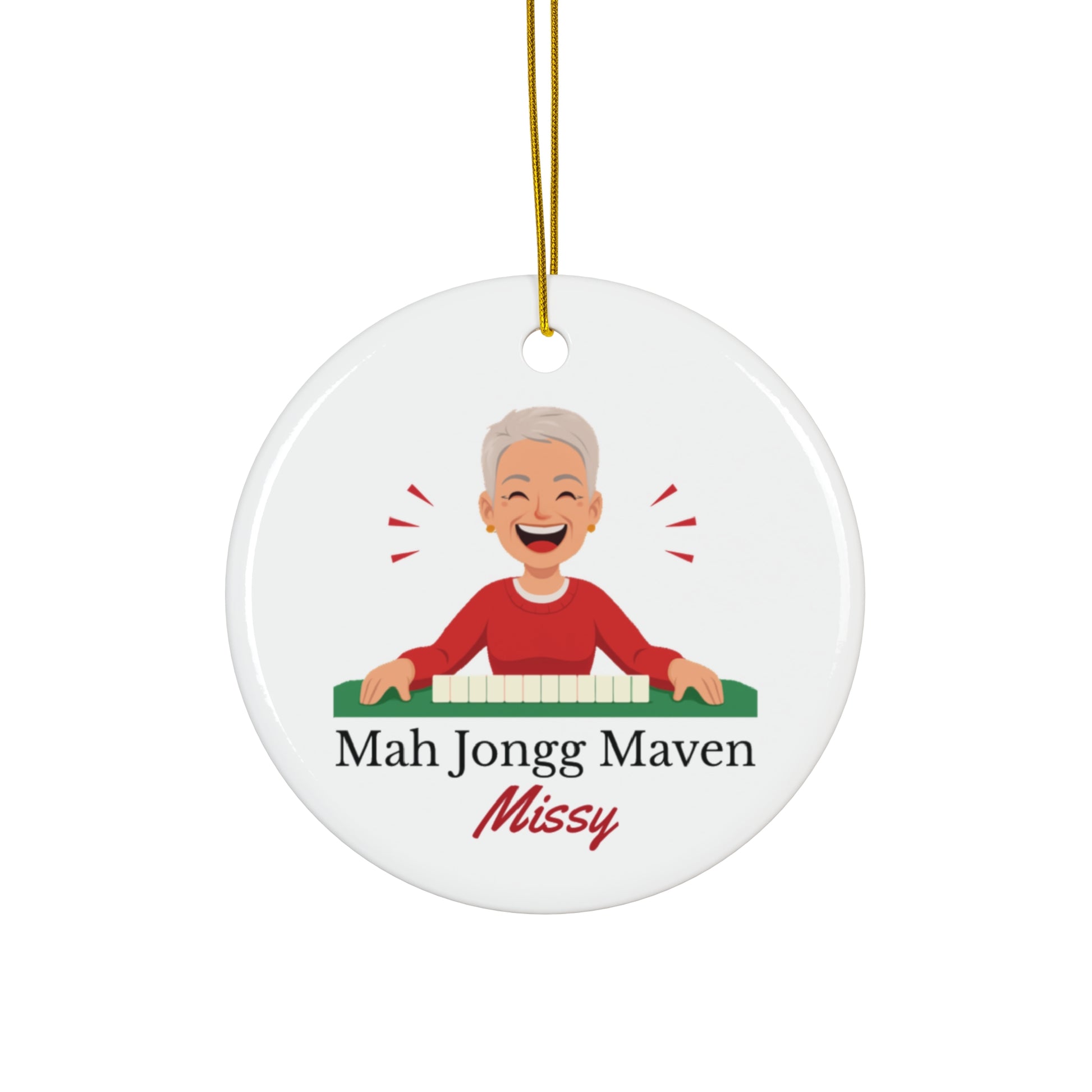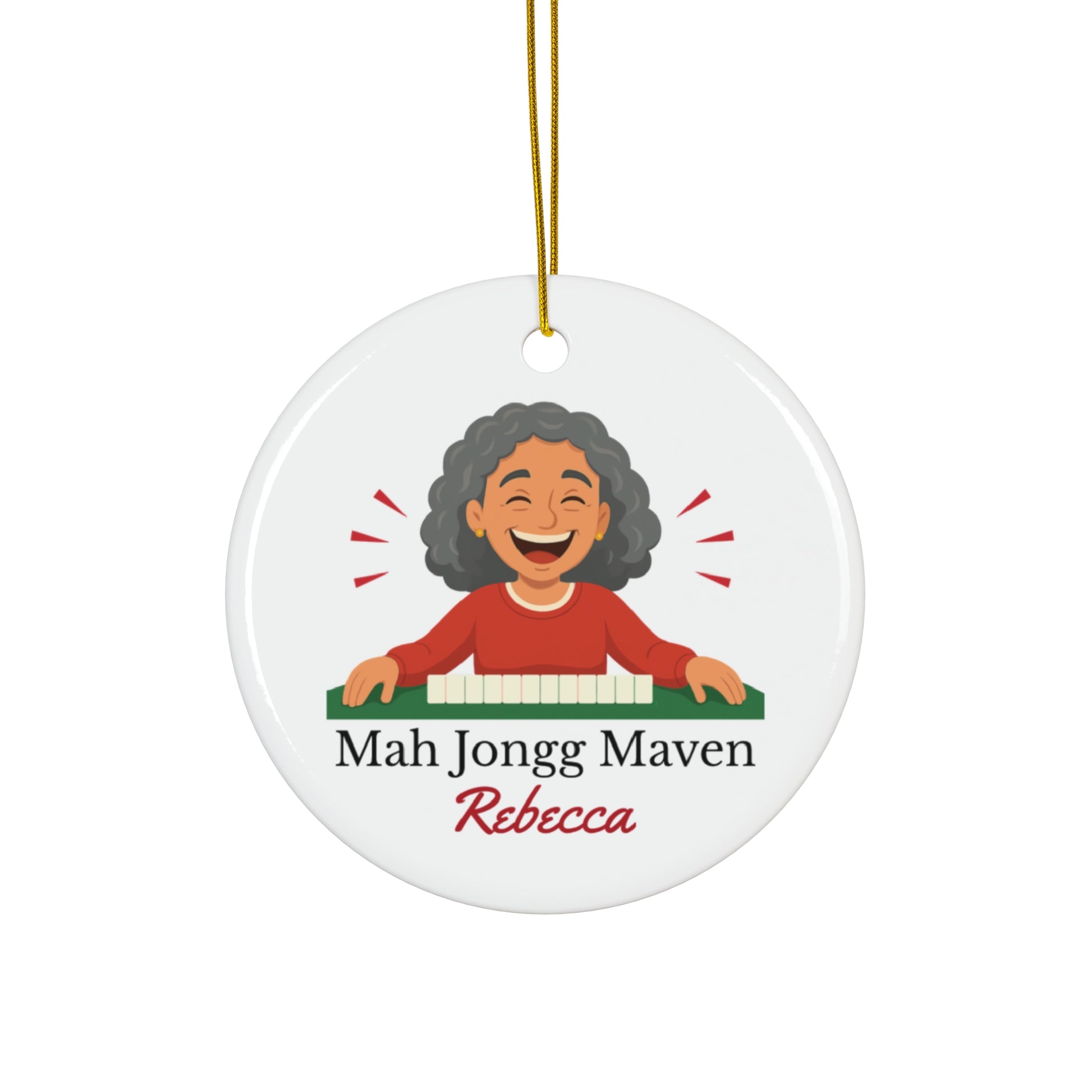 Add a touch of personalized fun to your holiday decor with this ceramic ornament featuring a cartoon avatar playing Mah Jongg and the phrase 'Mah Jongg Maven'. Perfect for Mah Jongg enthusiasts and those who love unique ornaments to hang on their Christmas tree or around the house during the holiday season. Don't see an avatar with the look you want? Contact us (merch@myjongg.net) and let's chat!