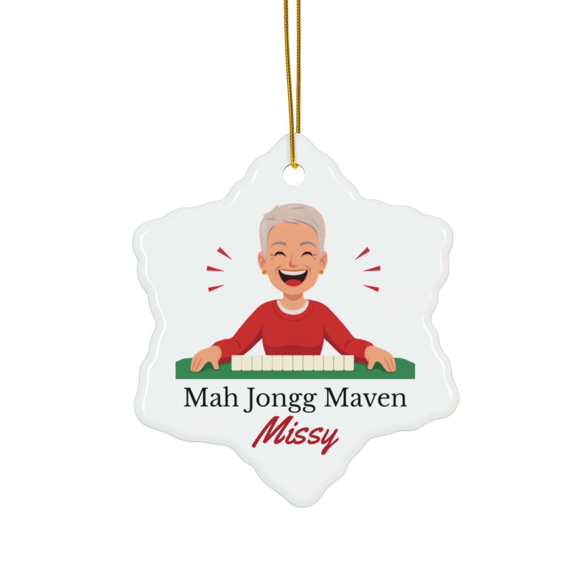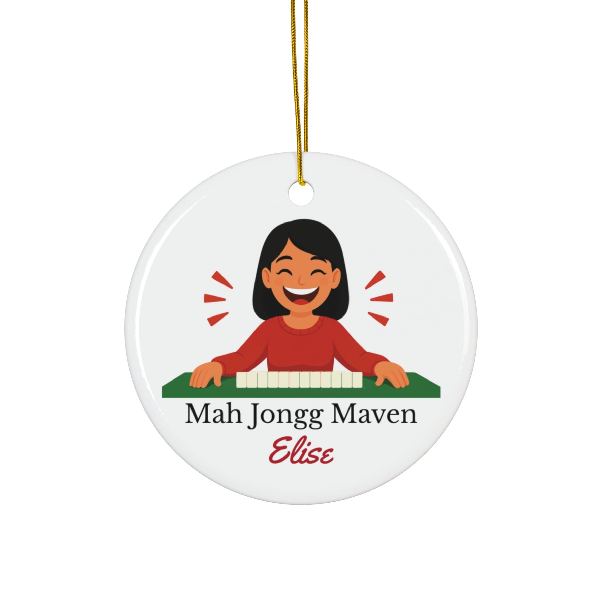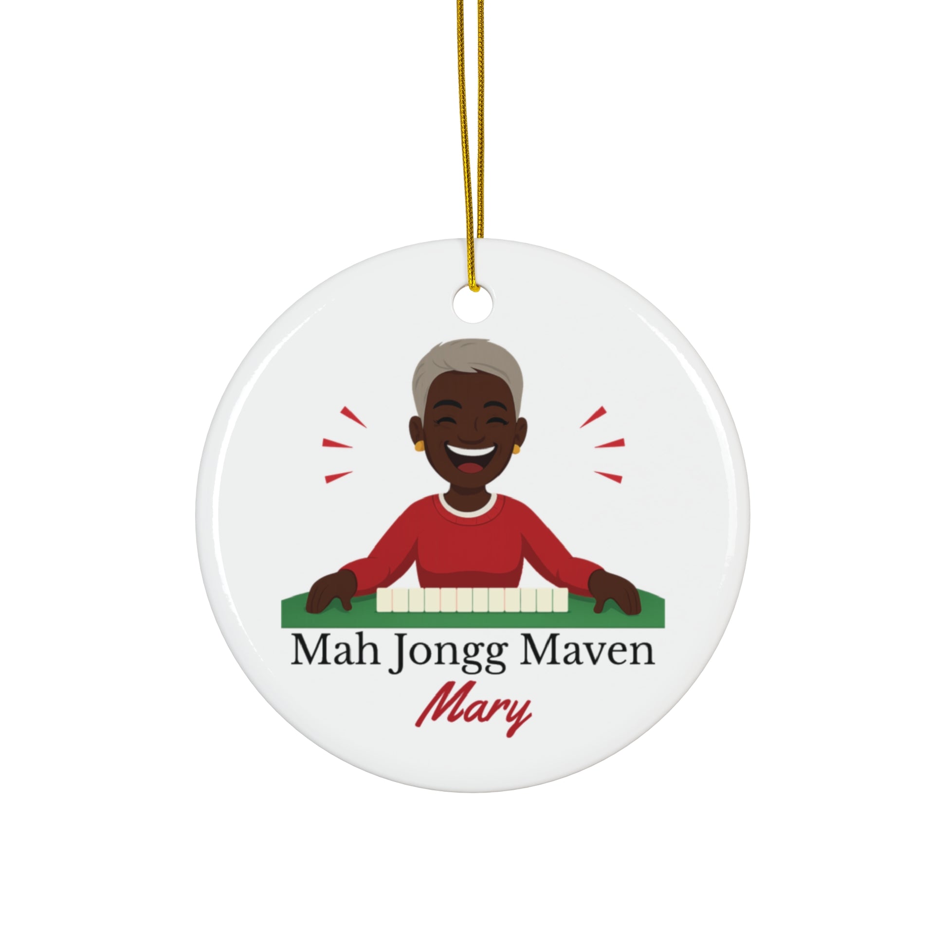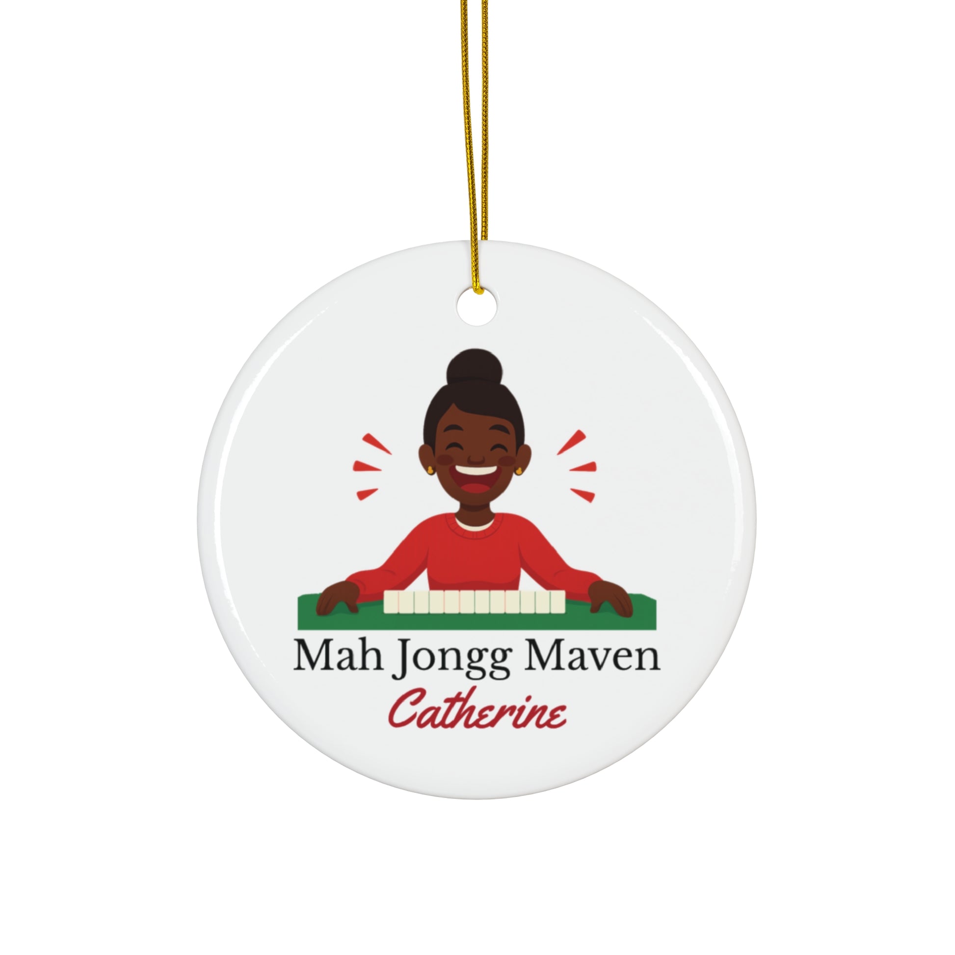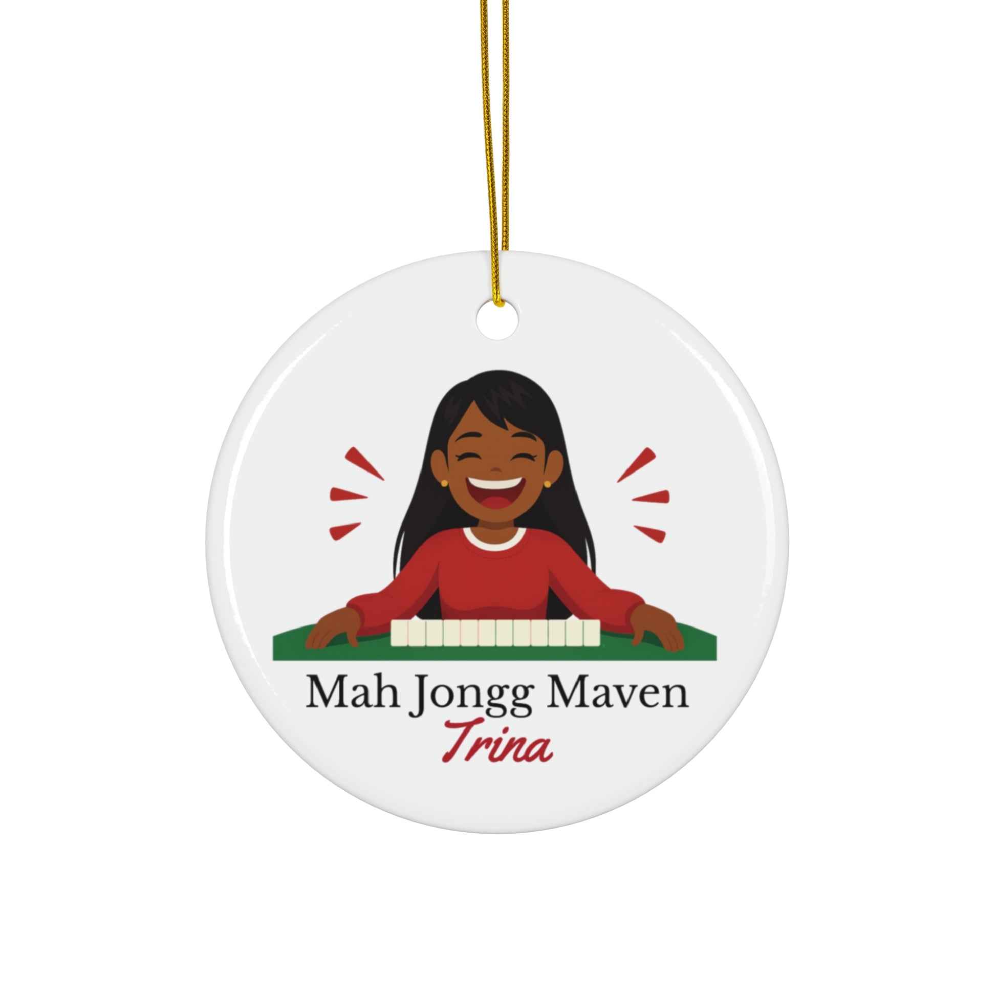 Add a touch of personalized fun to your holiday decor with this ceramic ornament featuring a cartoon avatar playing Mah Jongg and the phrase 'Mah Jongg Maven'. Perfect for Mah Jongg enthusiasts and those who love unique ornaments to hang on their Christmas tree or around the house during the holiday season. Don't see an avatar with the look you want? Contact us (merch@myjongg.net) and let's chat!