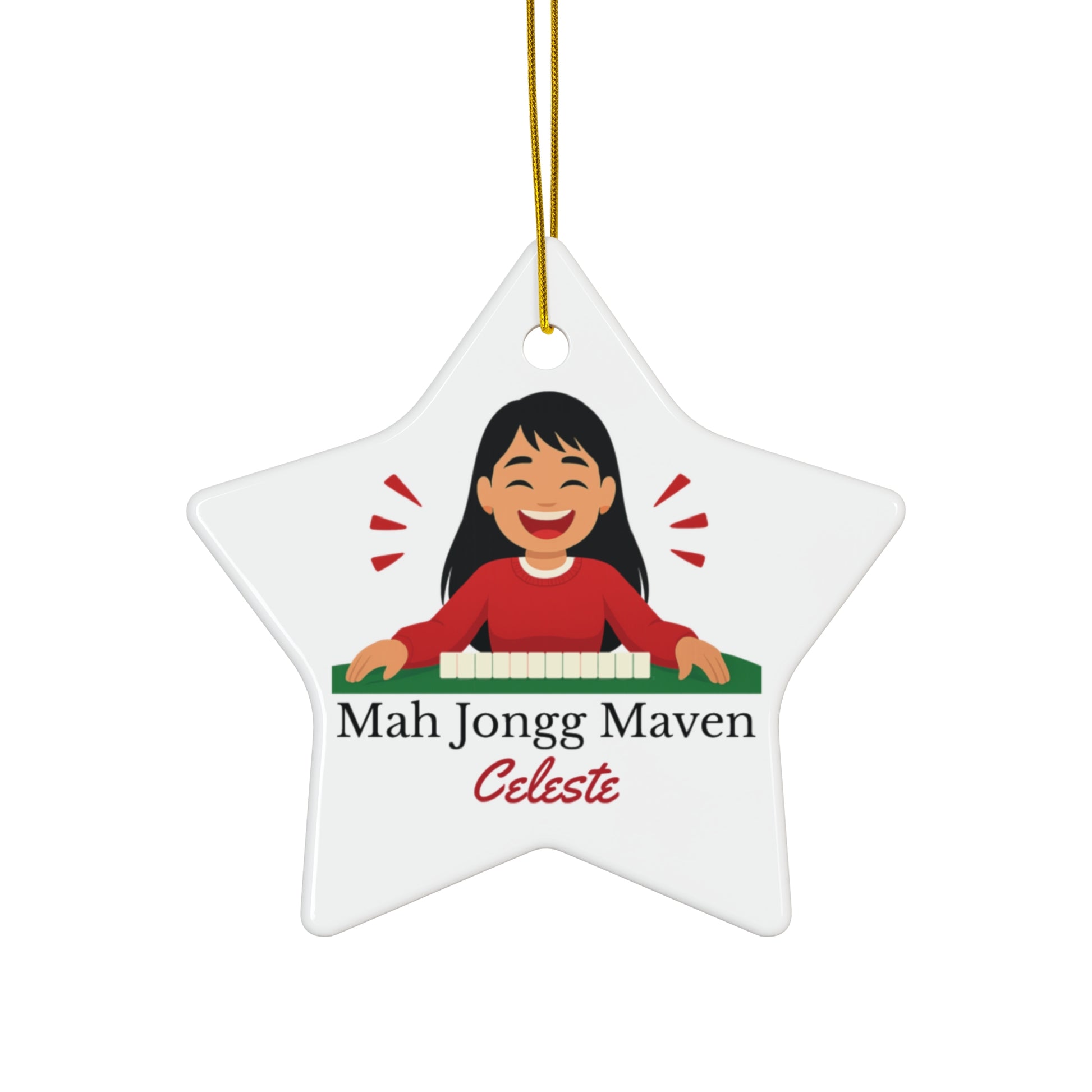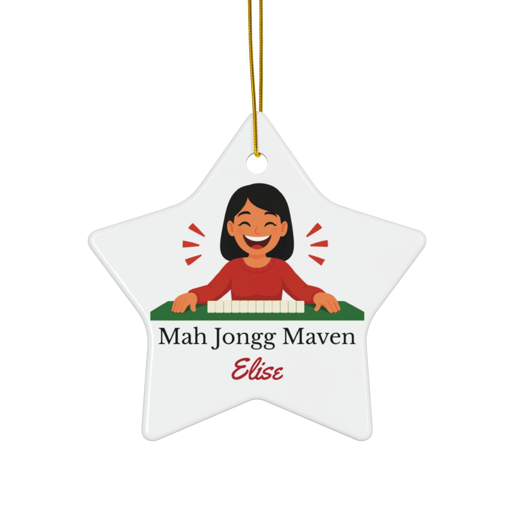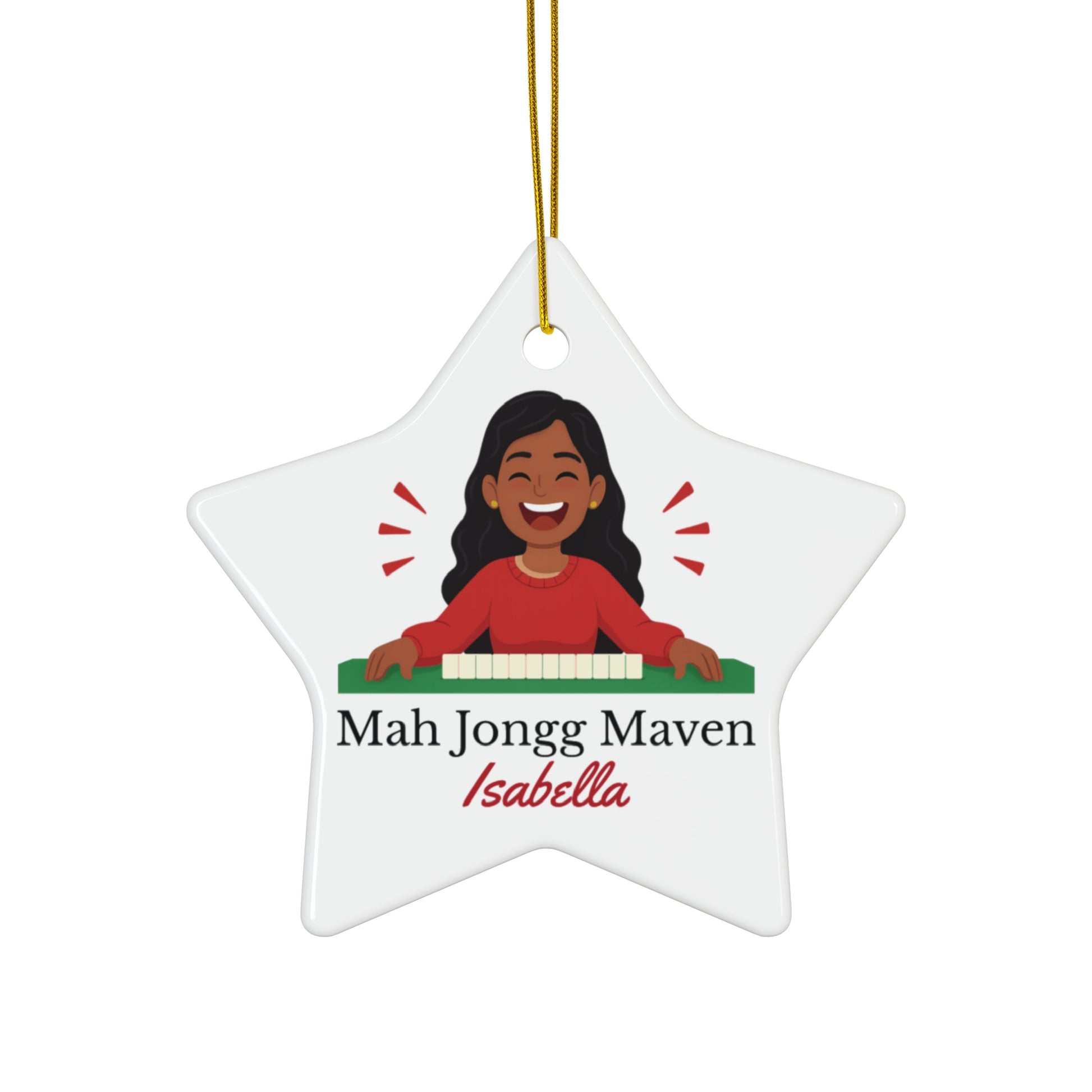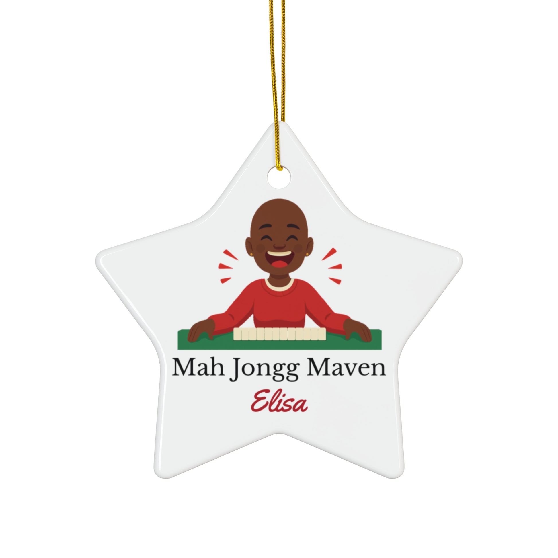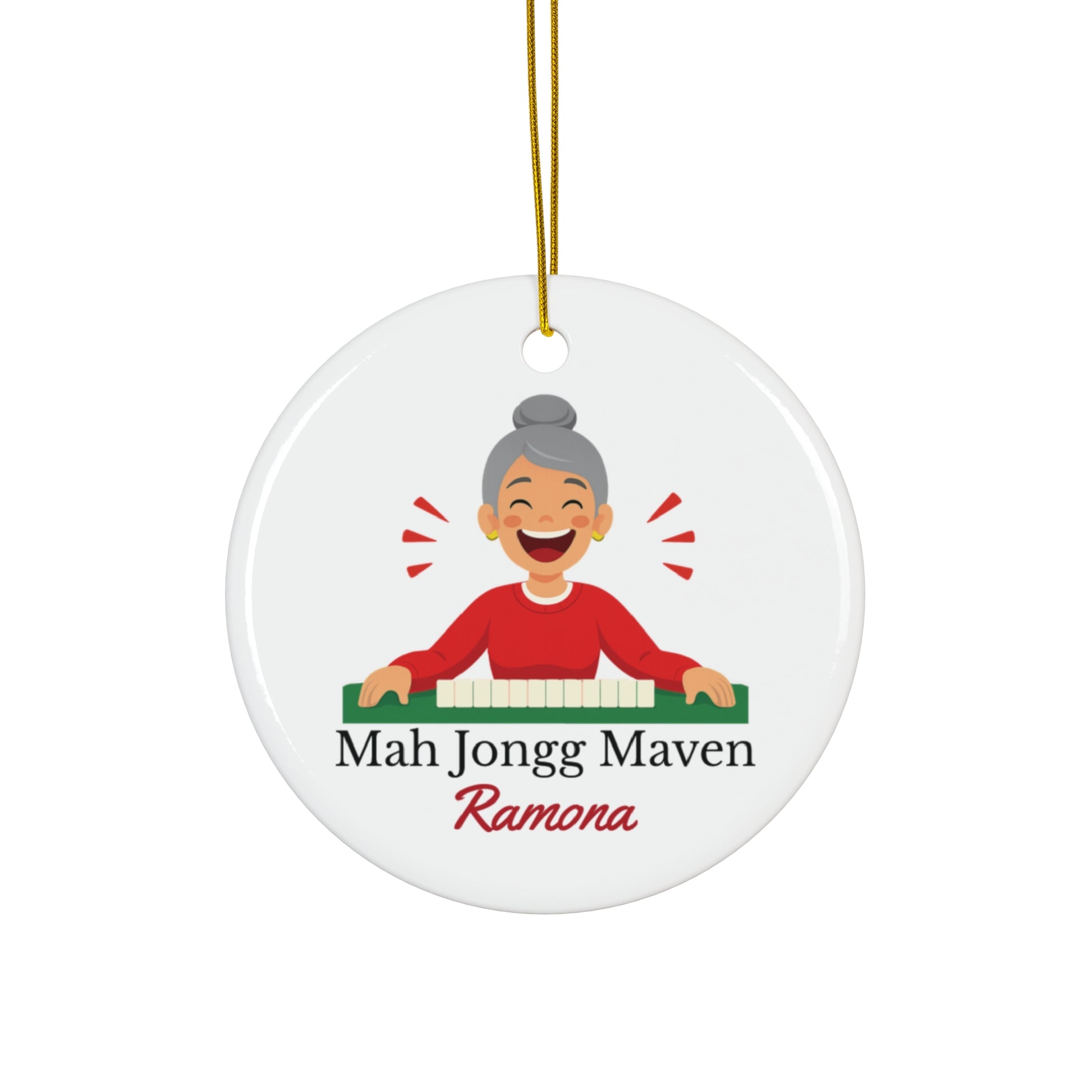 Add a touch of personalized fun to your holiday decor with this ceramic ornament featuring a cartoon avatar playing Mah Jongg and the phrase 'Mah Jongg Maven'. Perfect for Mah Jongg enthusiasts and those who love unique ornaments to hang on their Christmas tree or around the house during the holiday season. Don't see an avatar with the look you want? Contact us (merch@myjongg.net) and let's chat!