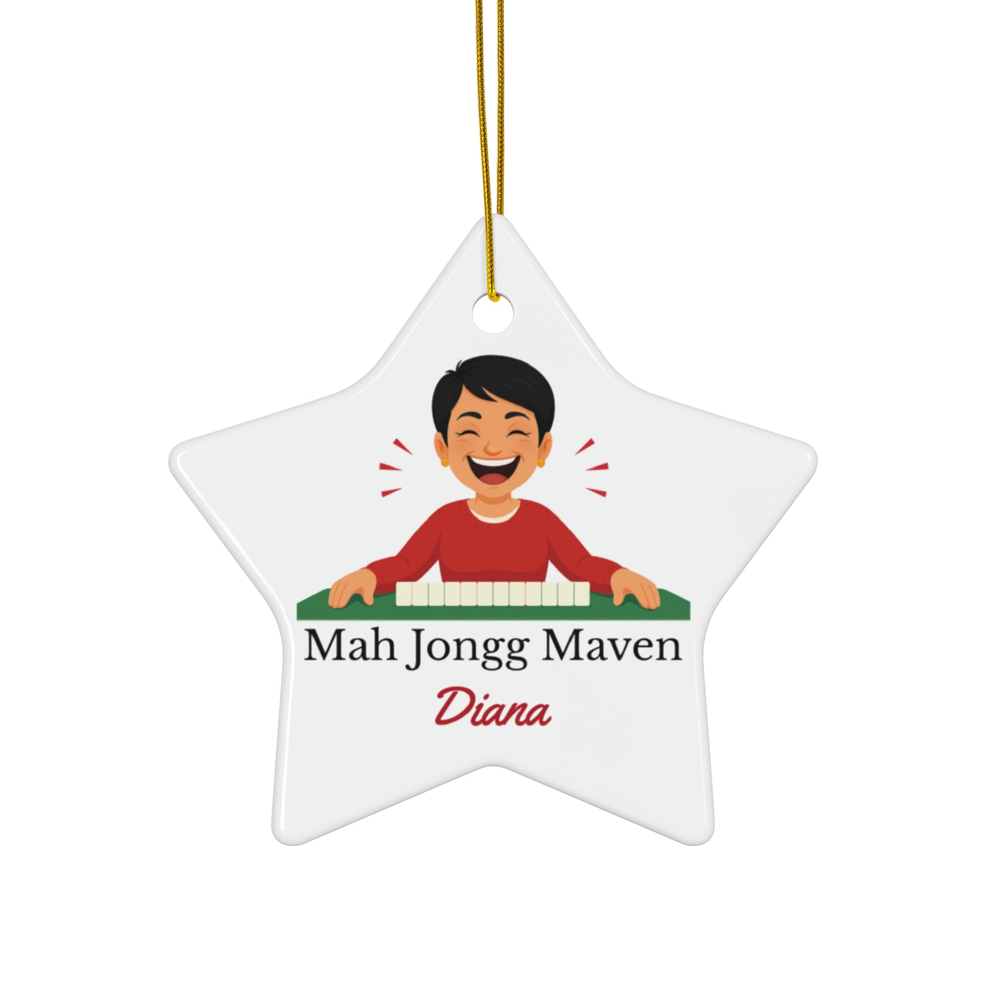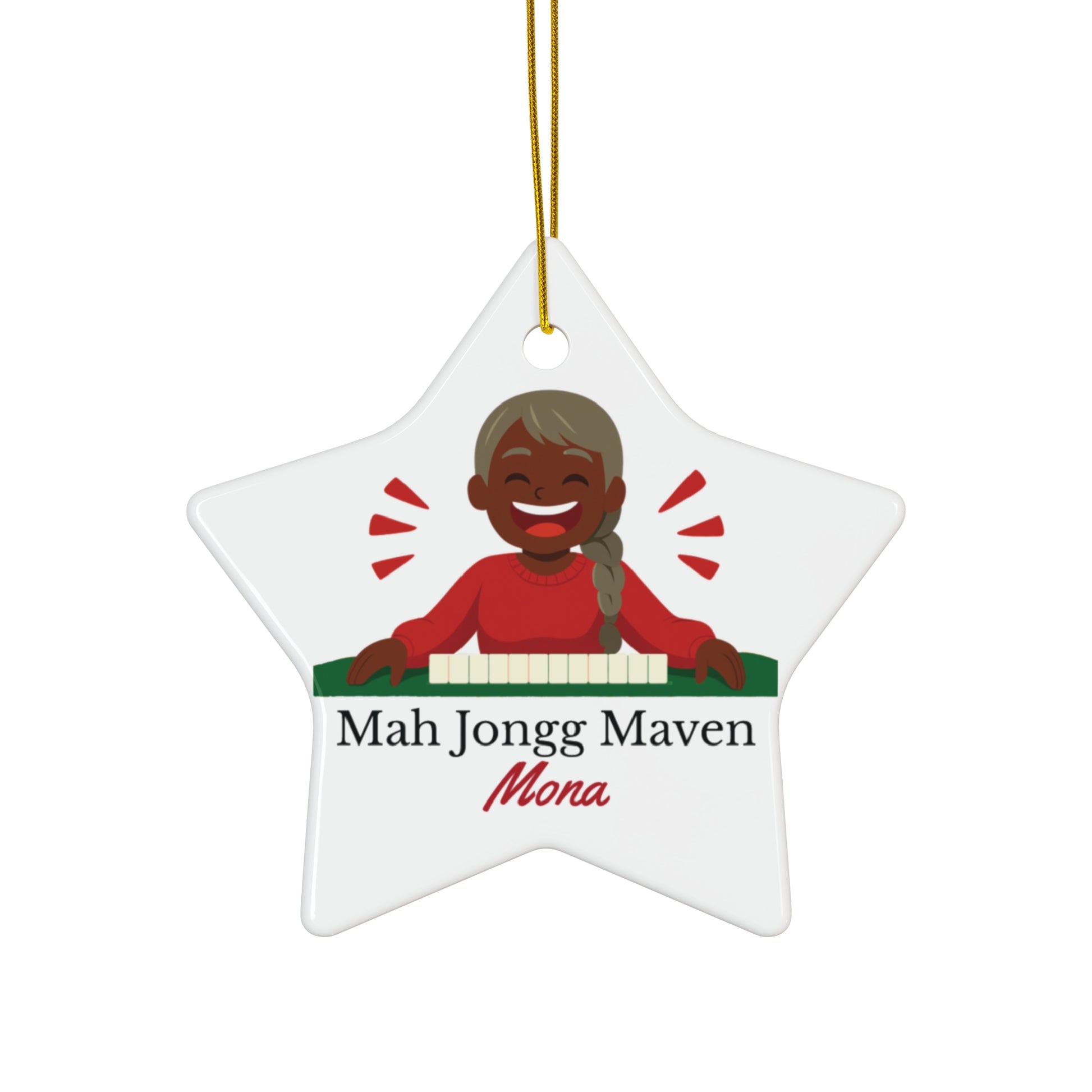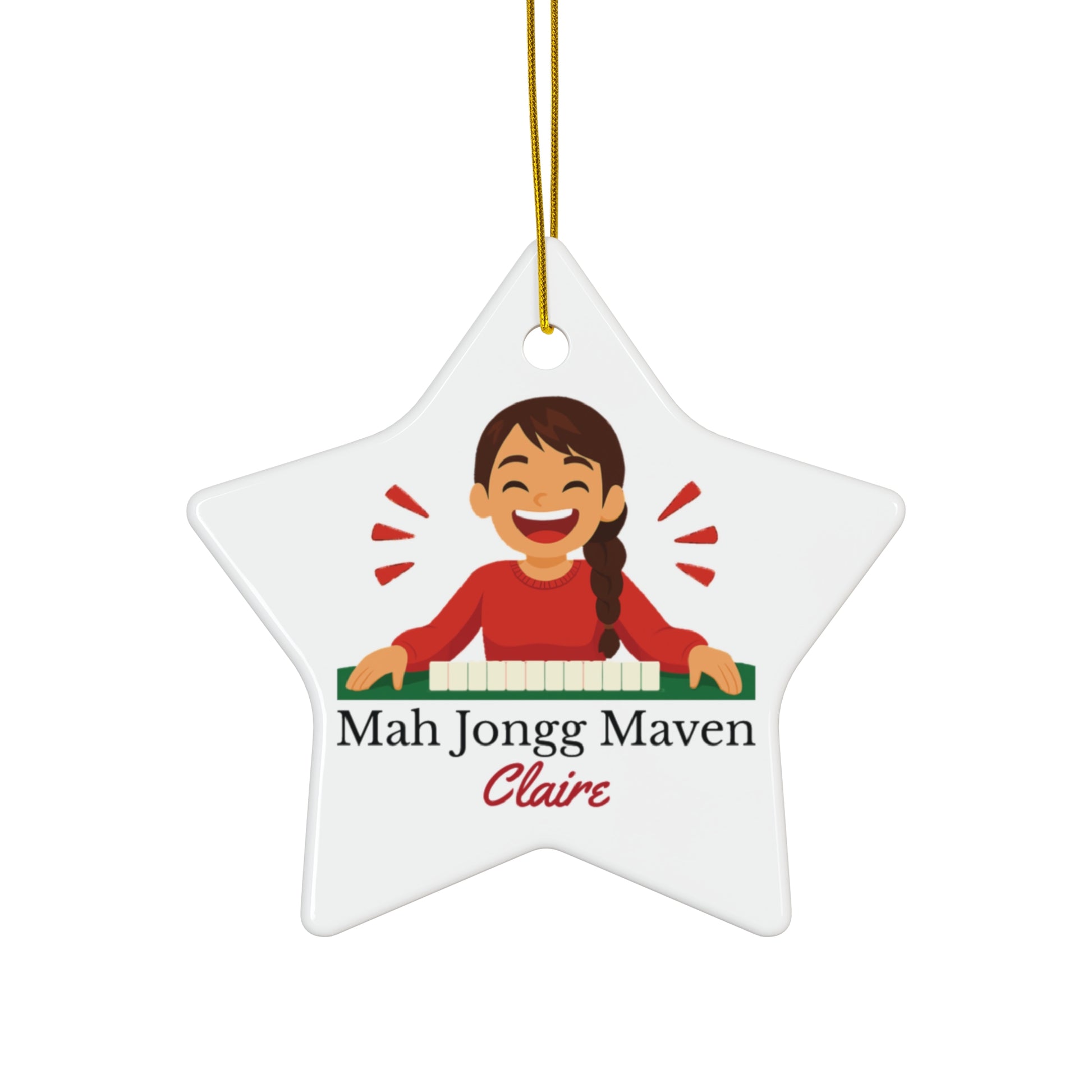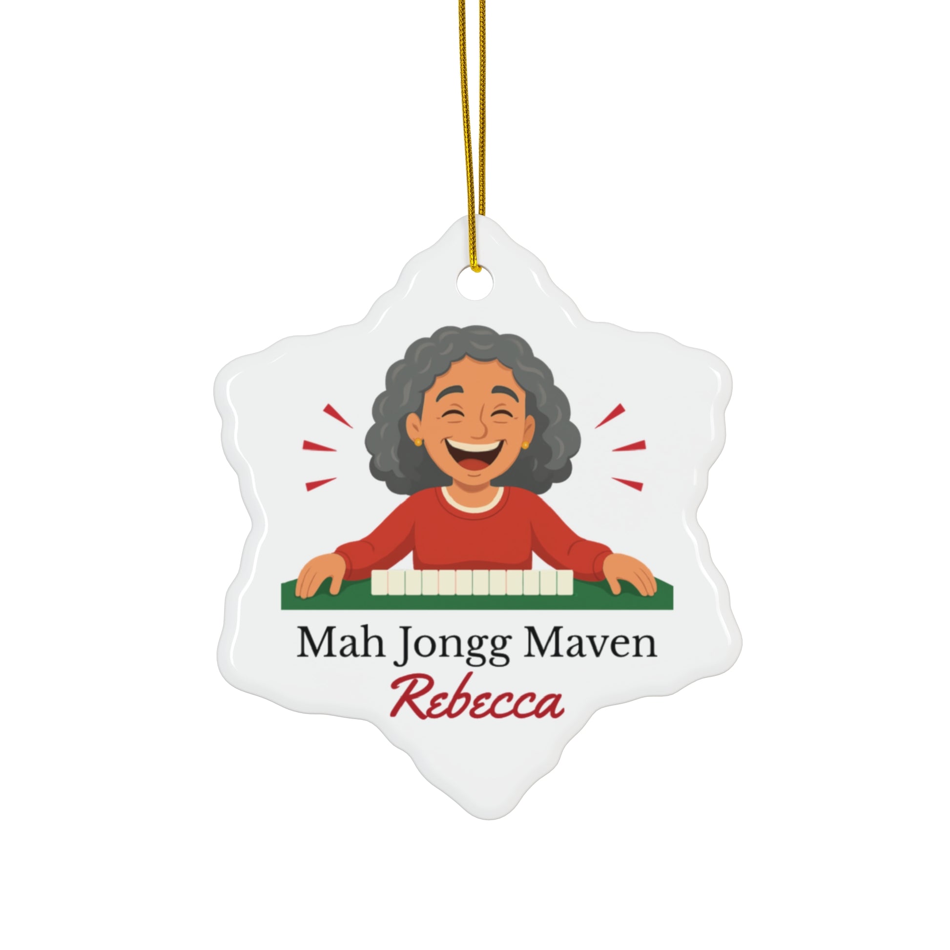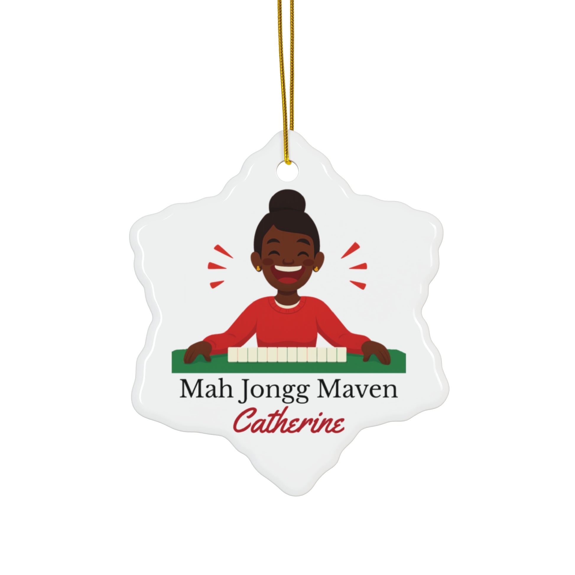 Add a touch of personalized fun to your holiday decor with this ceramic ornament featuring a cartoon avatar playing Mah Jongg and the phrase 'Mah Jongg Maven'. Perfect for Mah Jongg enthusiasts and those who love unique ornaments to hang on their Christmas tree or around the house during the holiday season. Don't see an avatar with the look you want? Contact us (merch@myjongg.net) and let's chat!
