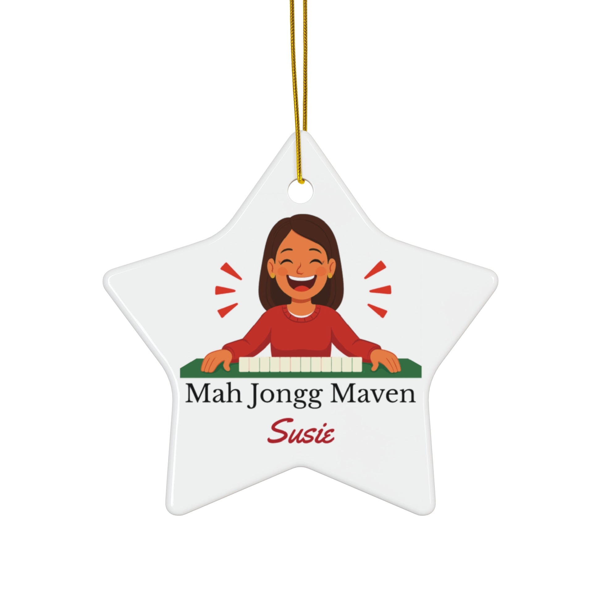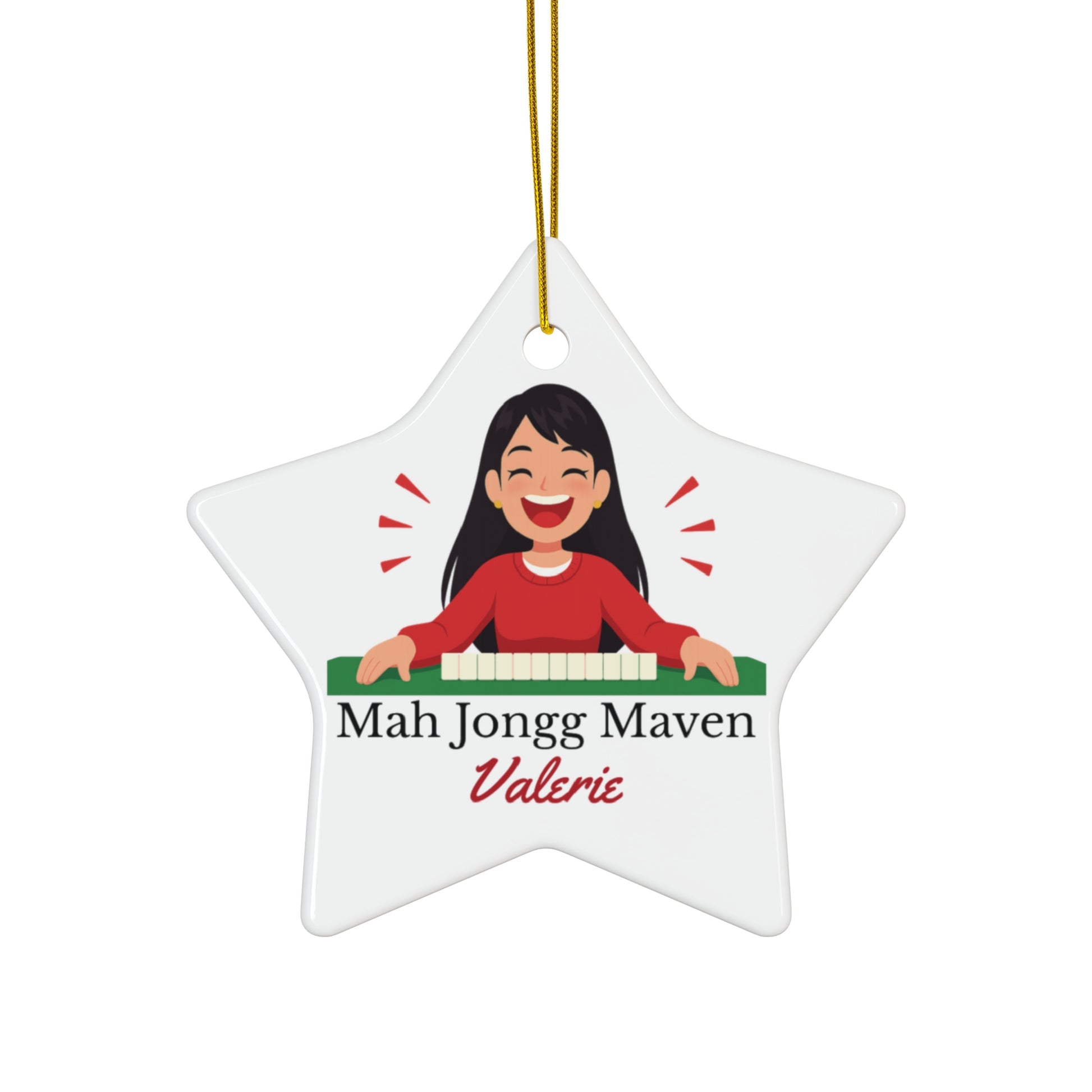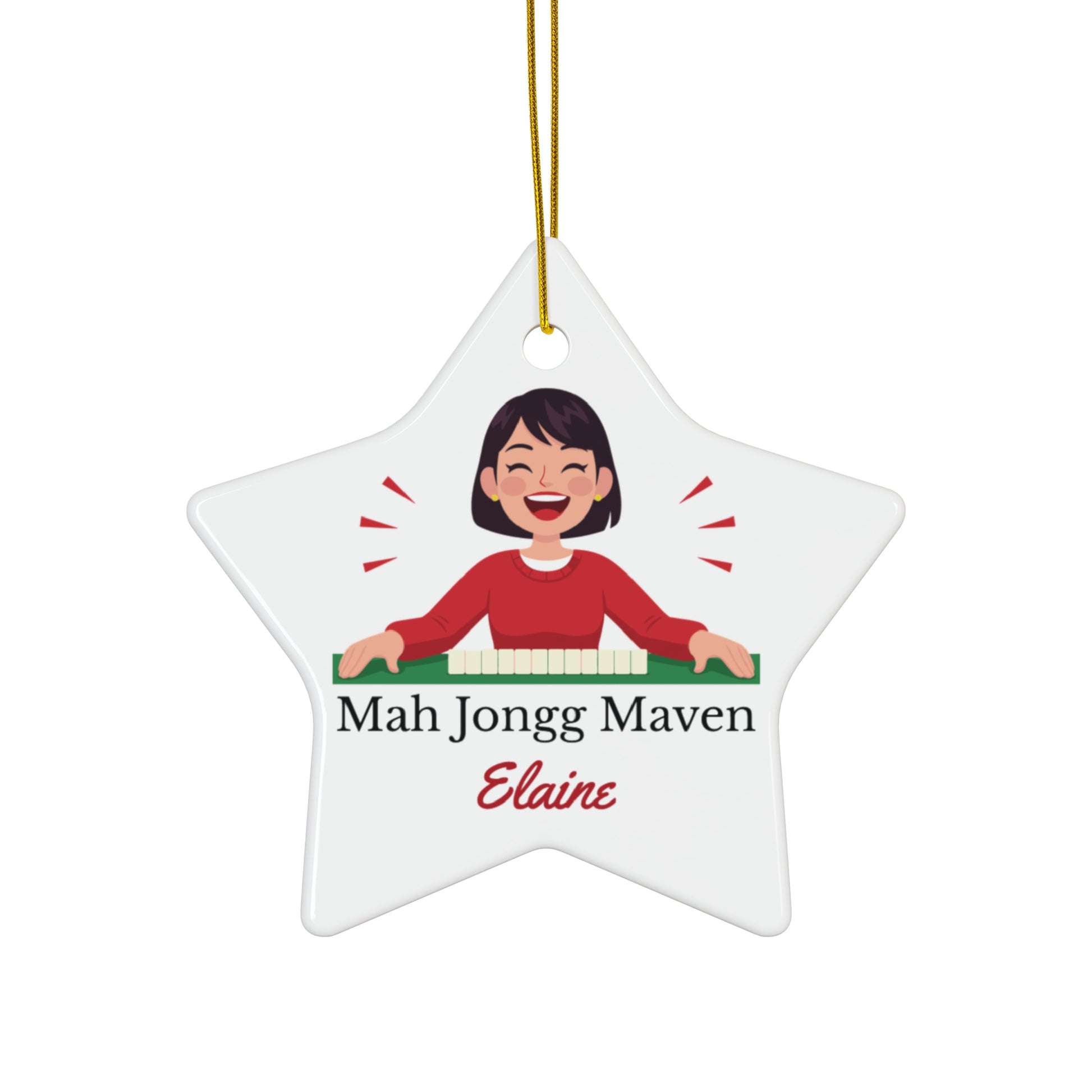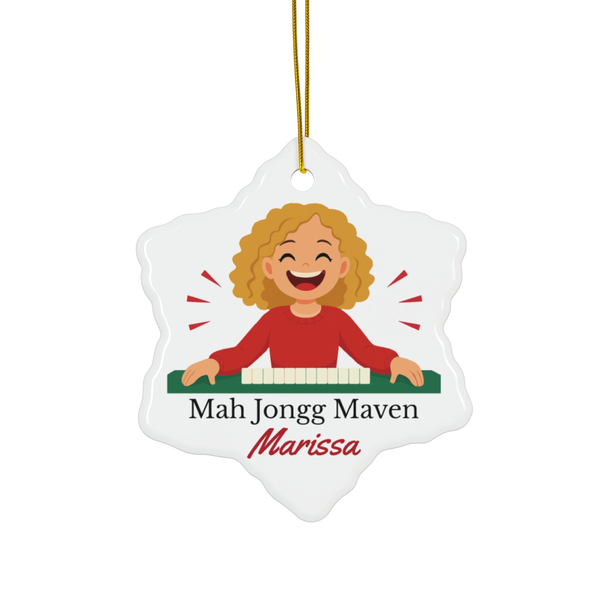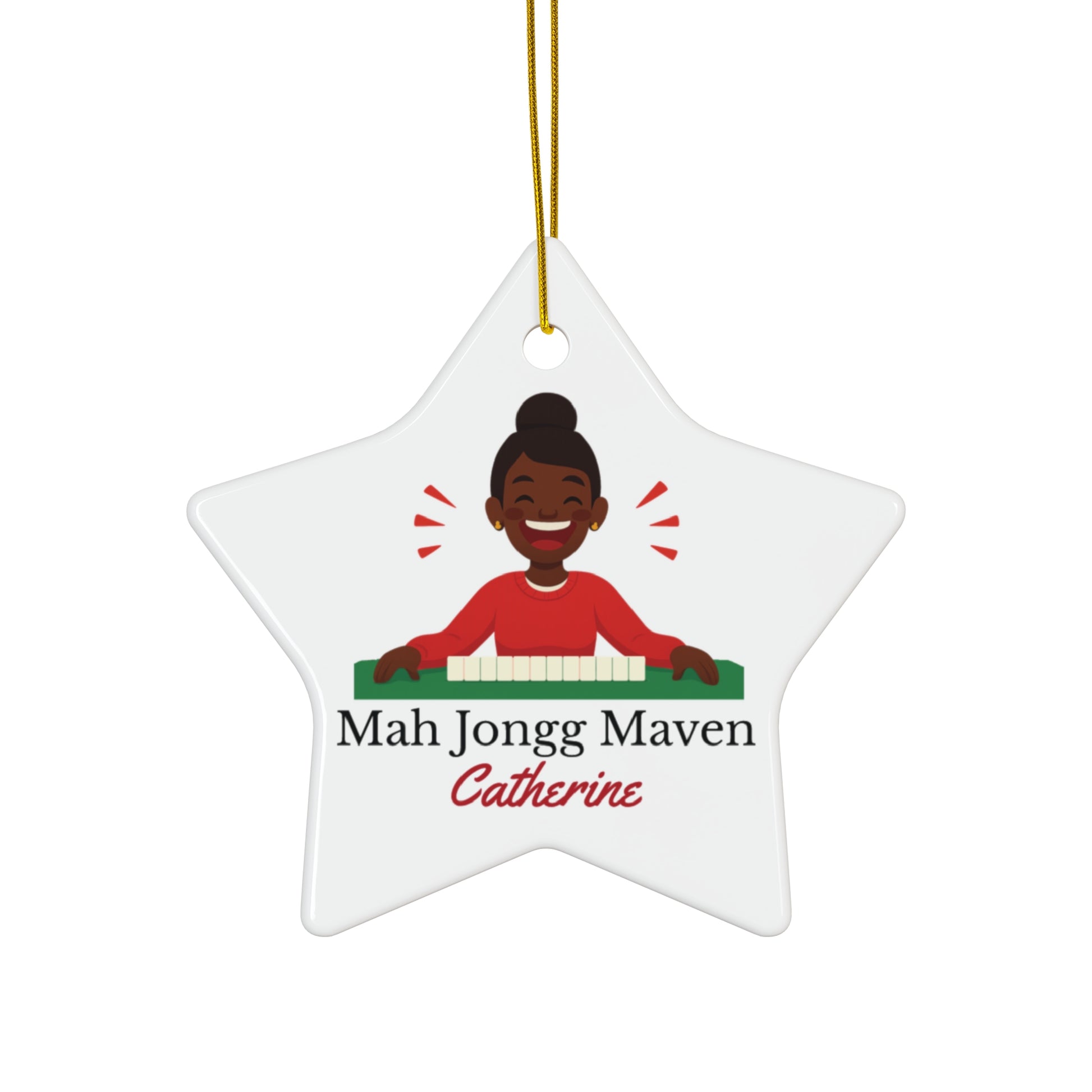 Add a touch of personalized fun to your holiday decor with this ceramic ornament featuring a cartoon avatar playing Mah Jongg and the phrase 'Mah Jongg Maven'. Perfect for Mah Jongg enthusiasts and those who love unique ornaments to hang on their Christmas tree or around the house during the holiday season. Don't see an avatar with the look you want? Contact us (merch@myjongg.net) and let's chat!