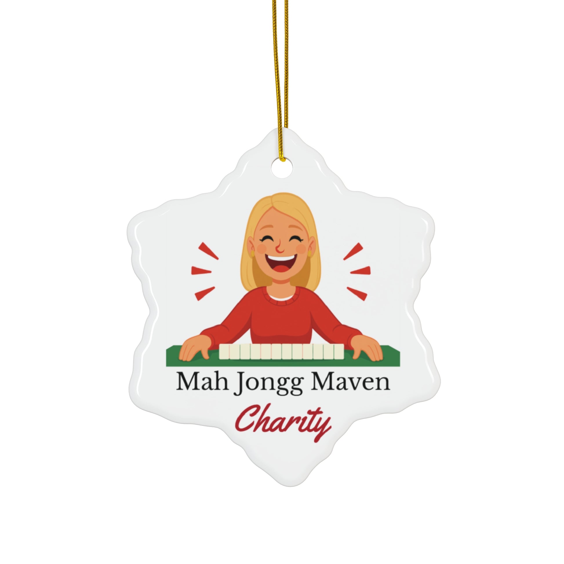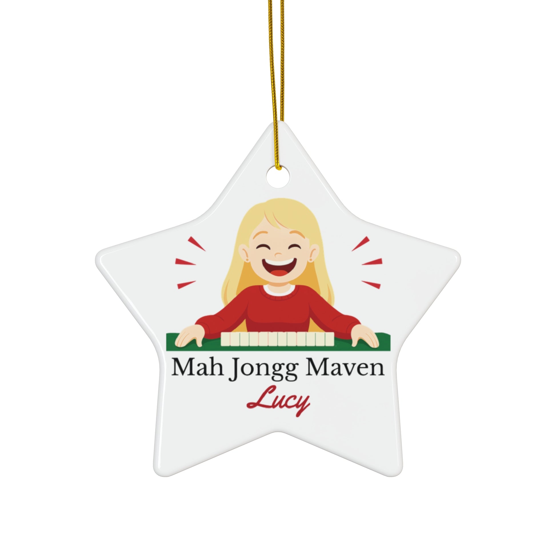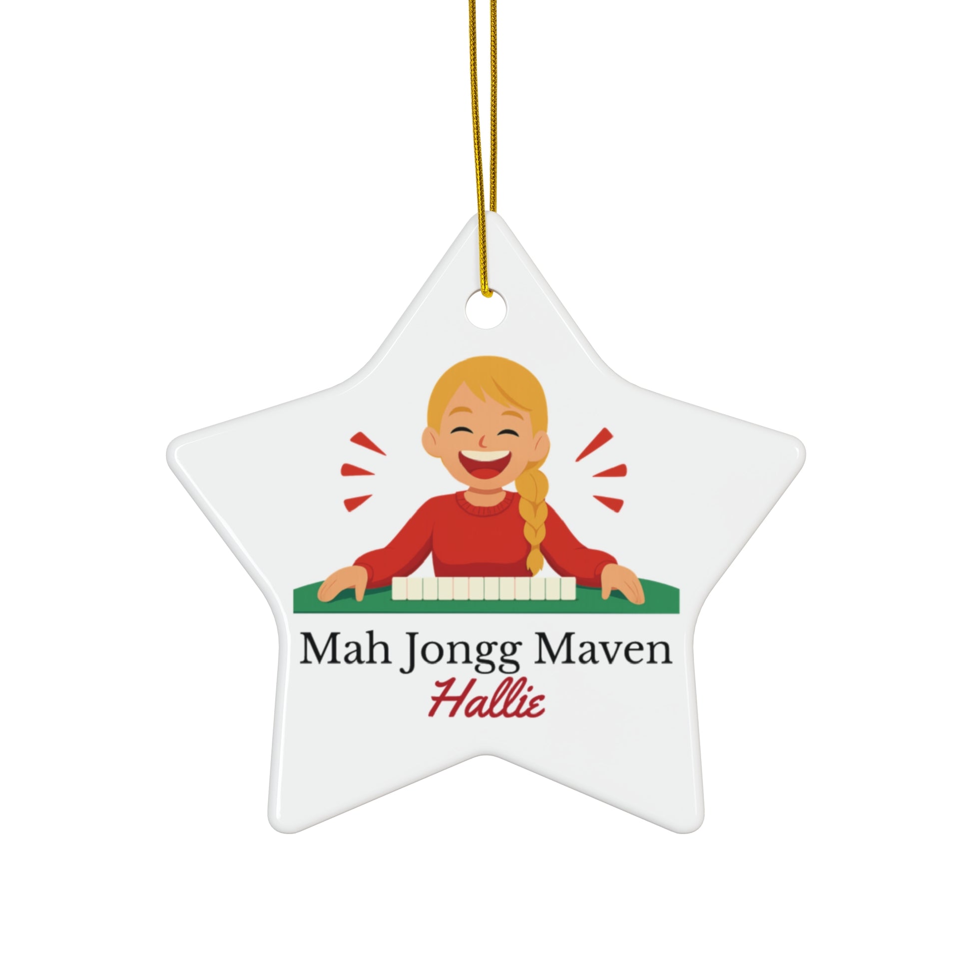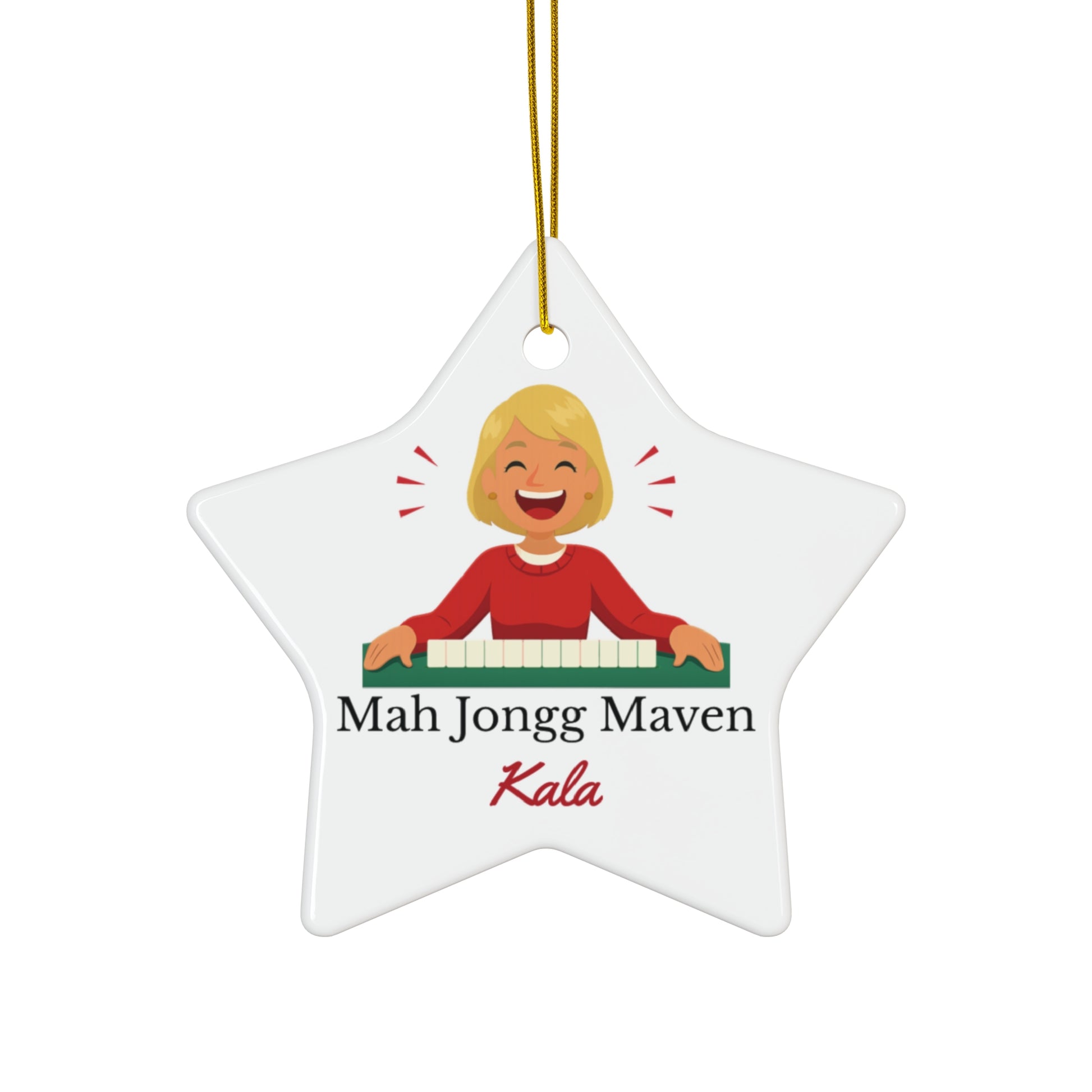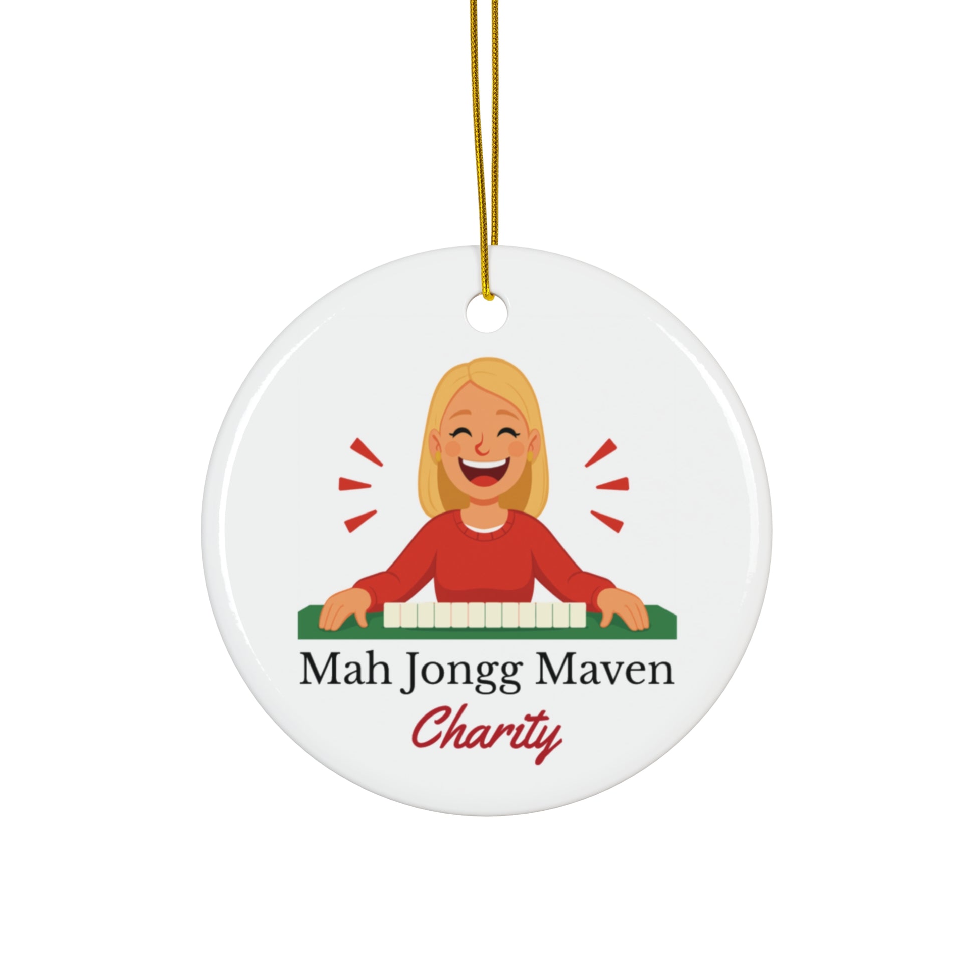 Add a touch of personalized fun to your holiday decor with this ceramic ornament featuring a cartoon avatar playing Mah Jongg and the phrase 'Mah Jongg Maven'. Perfect for Mah Jongg enthusiasts and those who love unique ornaments to hang on their Christmas tree or around the house during the holiday season. Don't see an avatar with the look you want? Contact us (merch@myjongg.net) and let's chat!