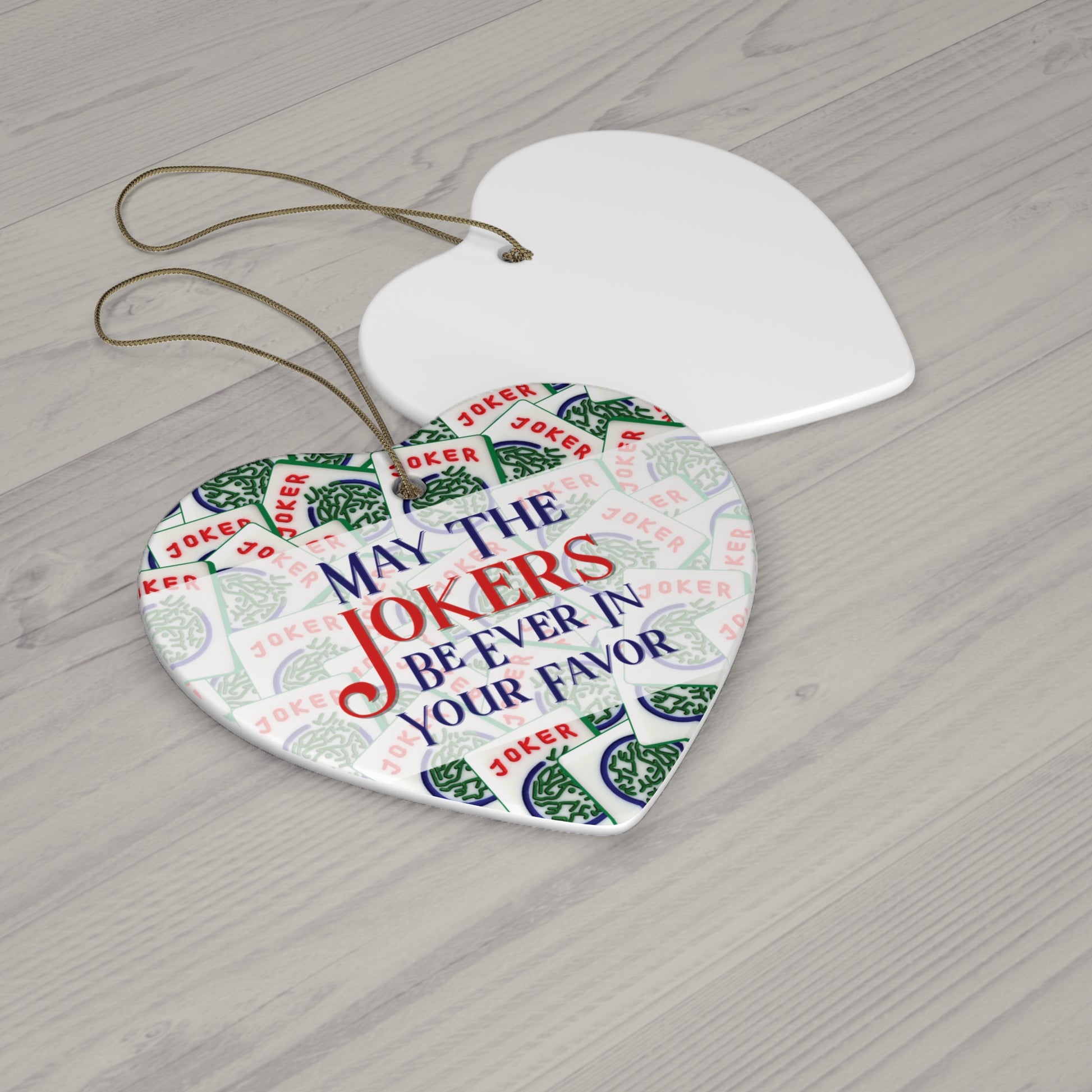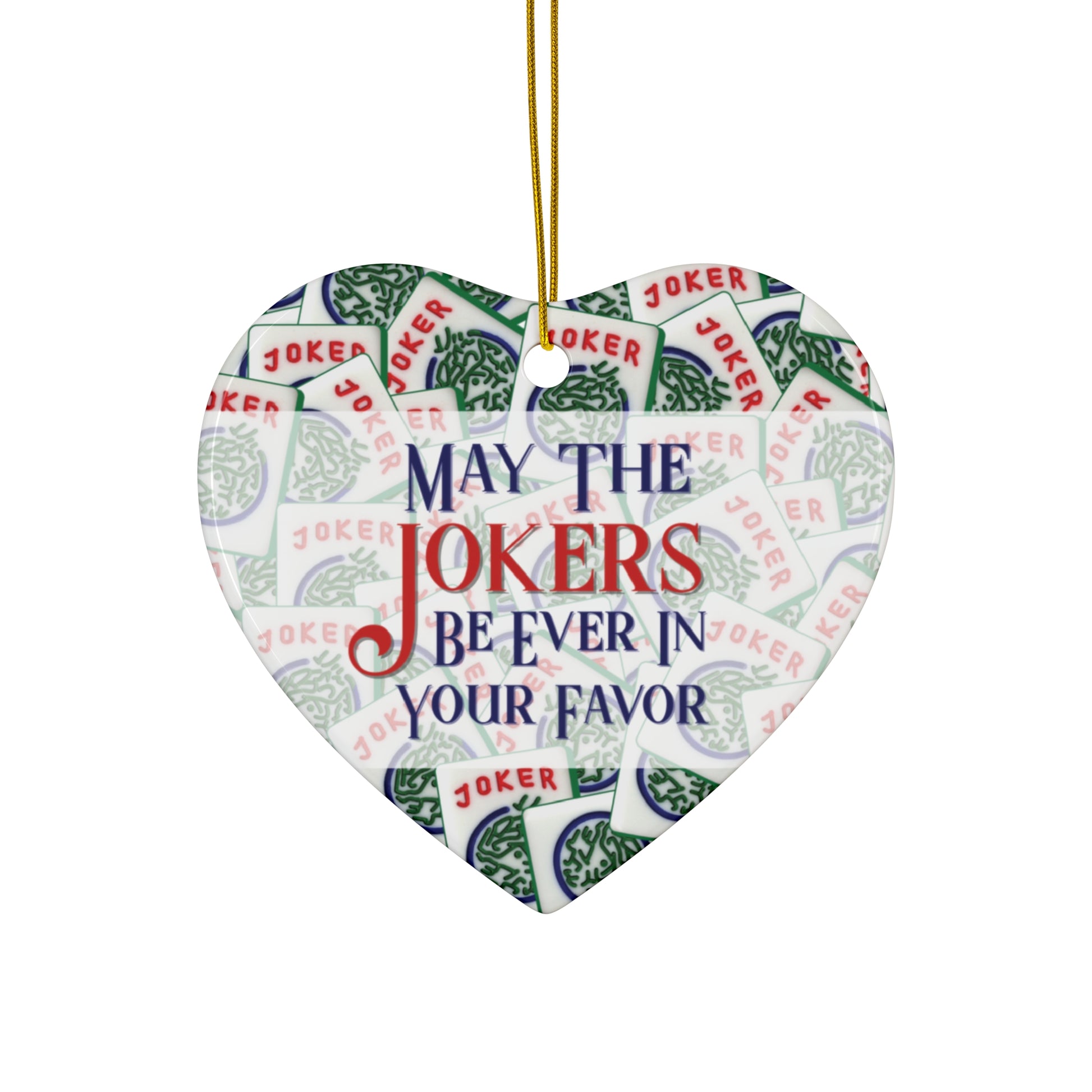 A whimsical ceramic ornament available in four shapes (snowflake, star, heart, and circle) featuring Mah Jongg joker tiles and the phrase 'May The Jokers Be Ever In Your Favor'. Perfect for adding a touch of fun and luck to your holiday decor. Ideal for Mah Jongg enthusiasts and those who appreciate unique ornaments.