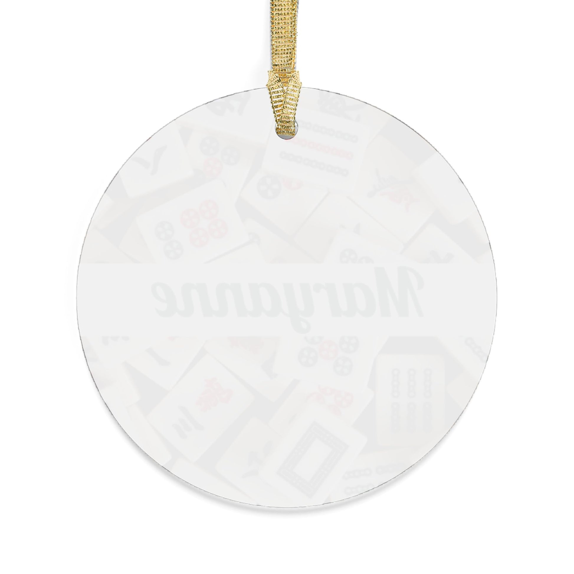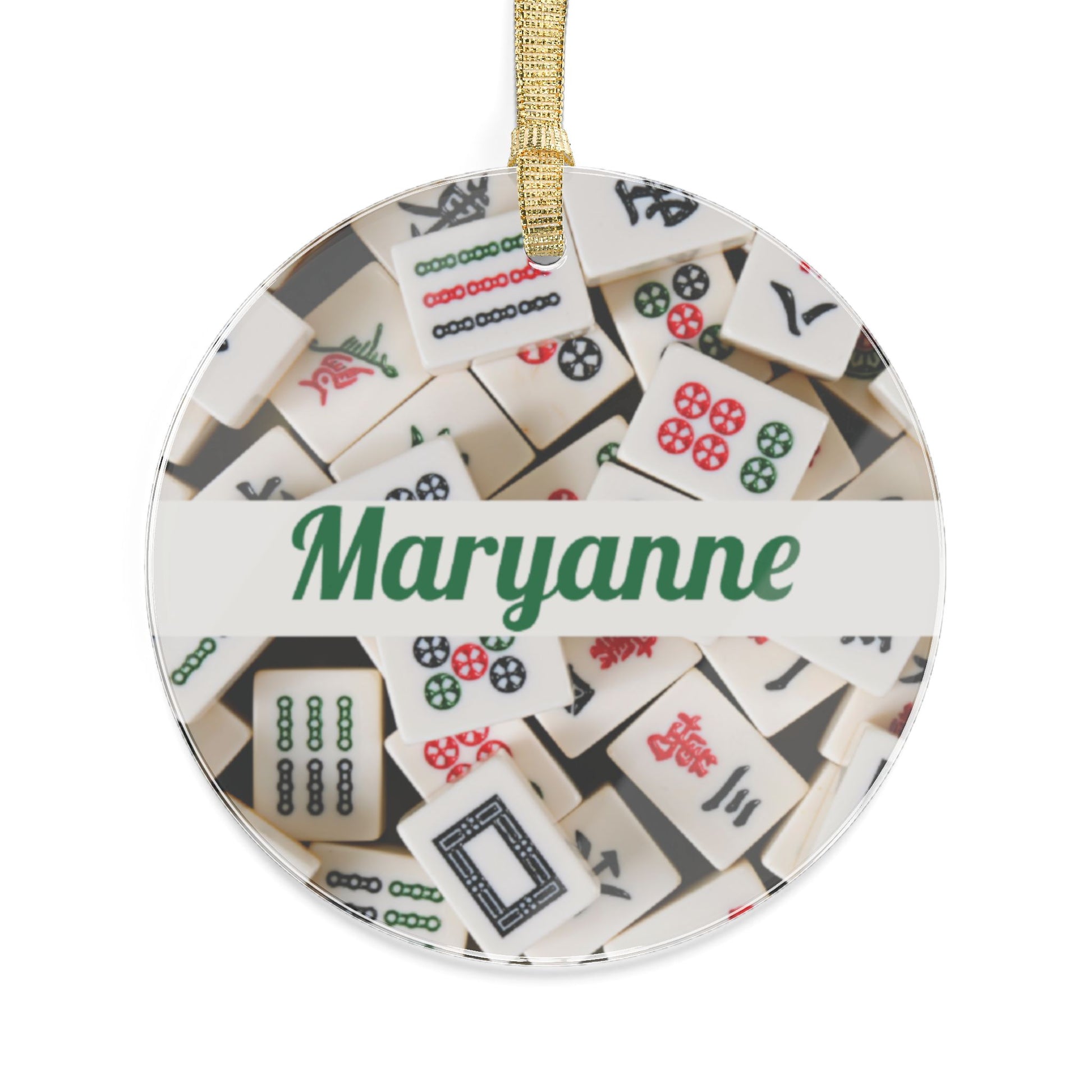 This acrylic ornament brings a quiet, playful elegance to any space. Clear acrylic captures a crisp, glass-like look while keeping the piece light and unbreakable. A backdrop of classic Mah Jongg tiles frames a custom name. Hang it on a tree, in a game room, or from a window where the glossy finish catches the light and the bright print pops against the clear material. It feels personal and familiar — a nod to ritual, laughter, and the old tile shuffle passed between loved ones.